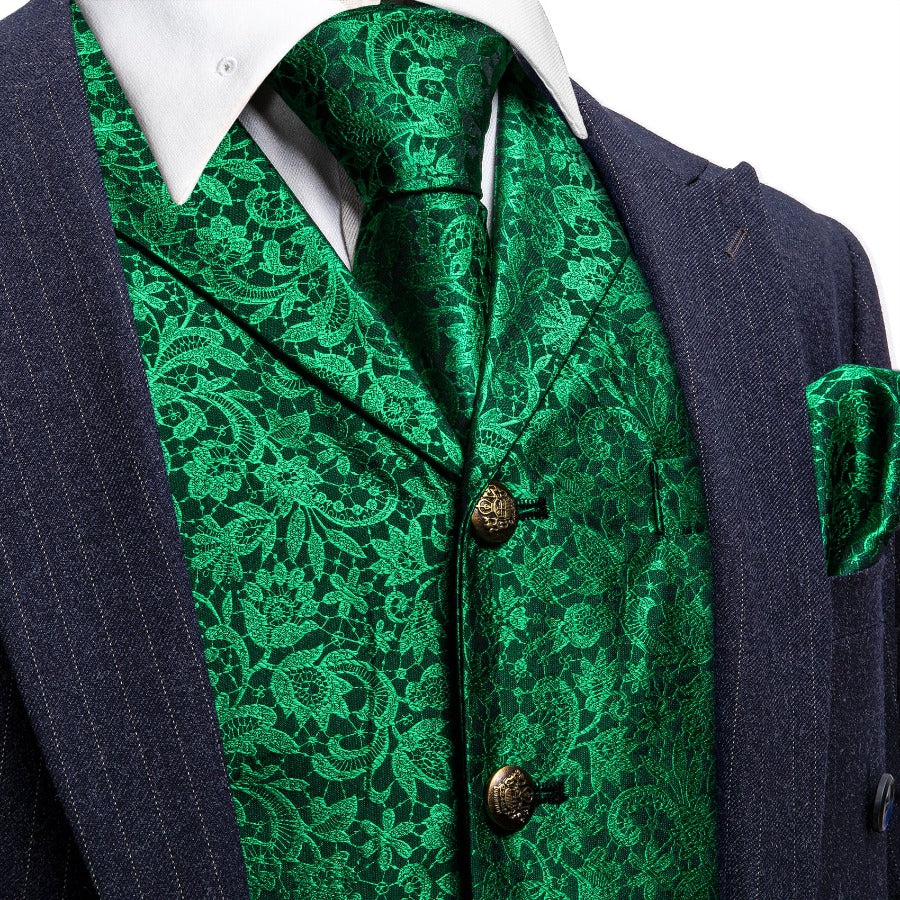 Barry. Wang Emerald Green Vest Suit Silk Paisley Dress Vest Necktie Hanky Cufflinks Set