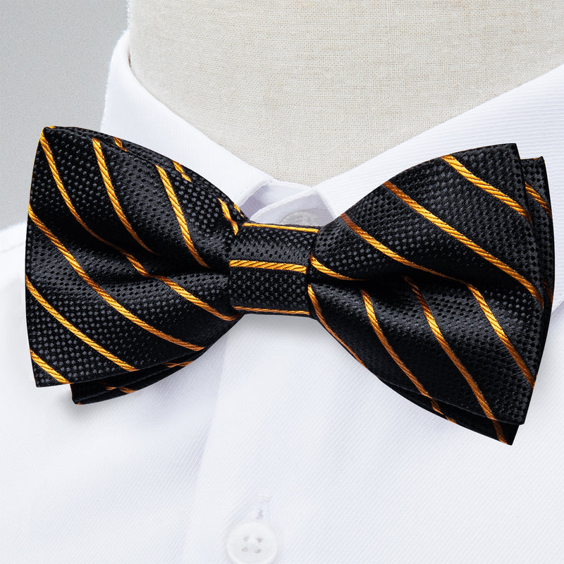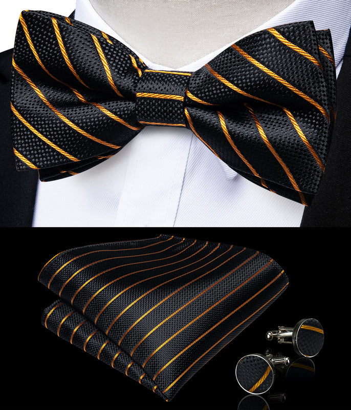 Barry. Wang Black Gold Stripe Bowtie Pocket Square Cufflinks Set