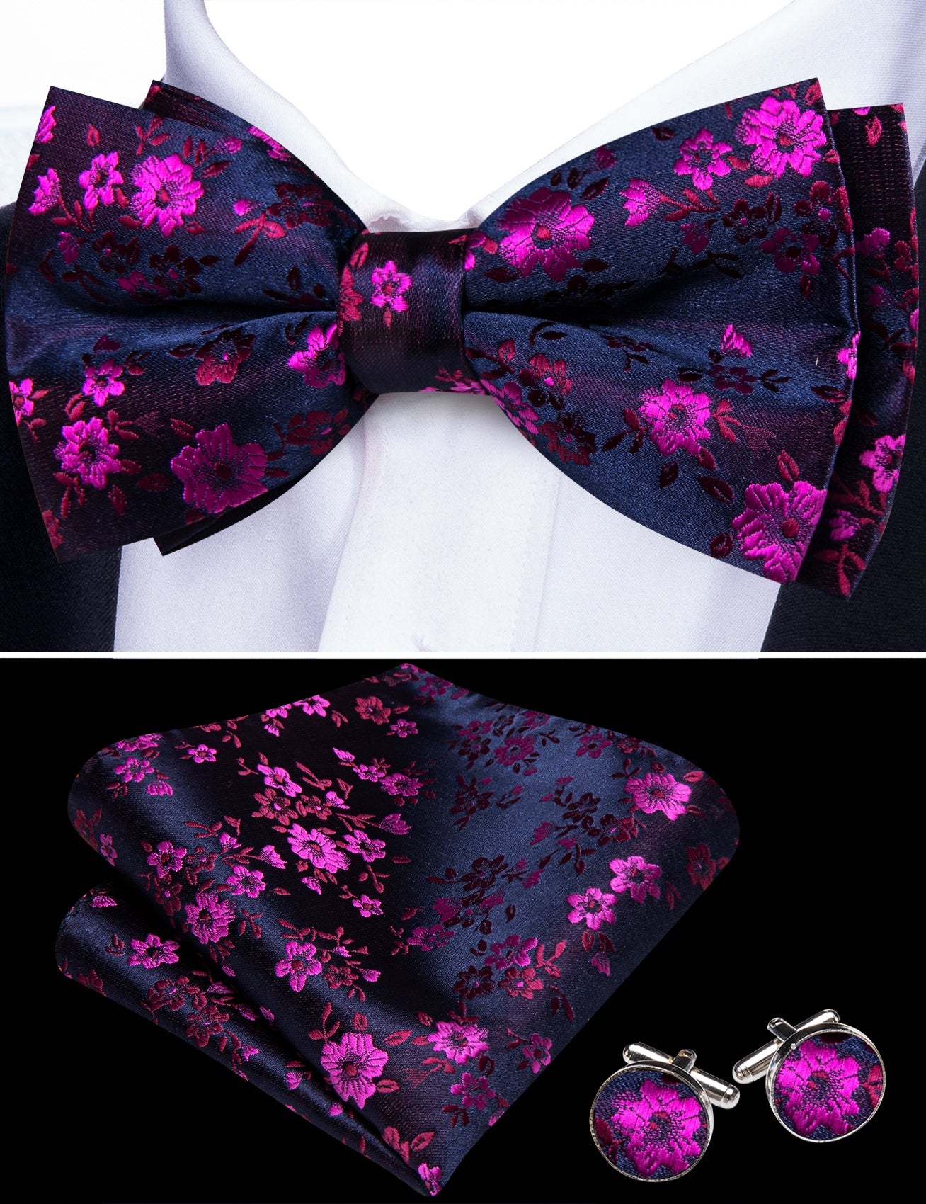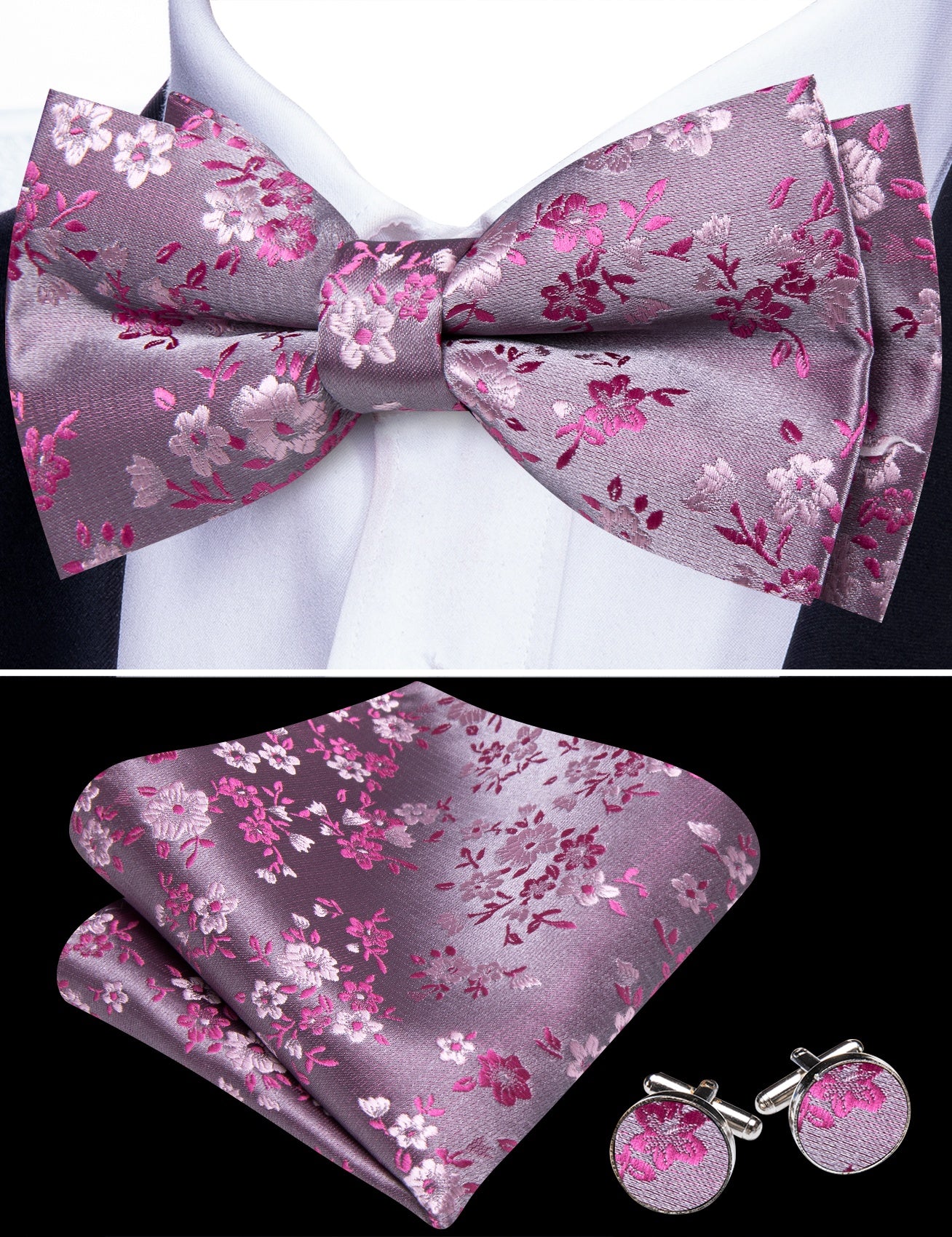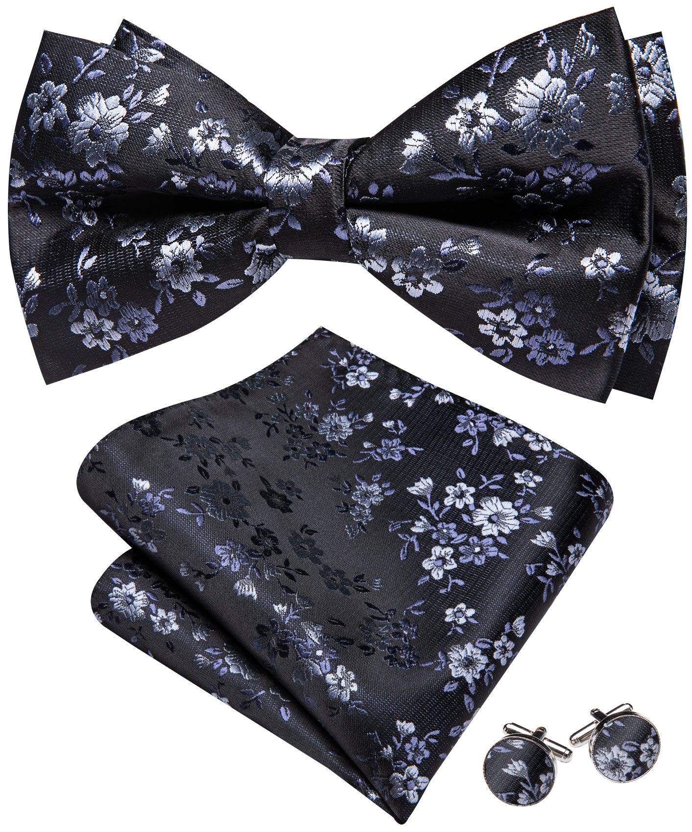 Barry. Wang Black Silver Bowtie for Wedding Party Pre-tied Floral Silk Bowtie Pocket Square Cufflinks Set