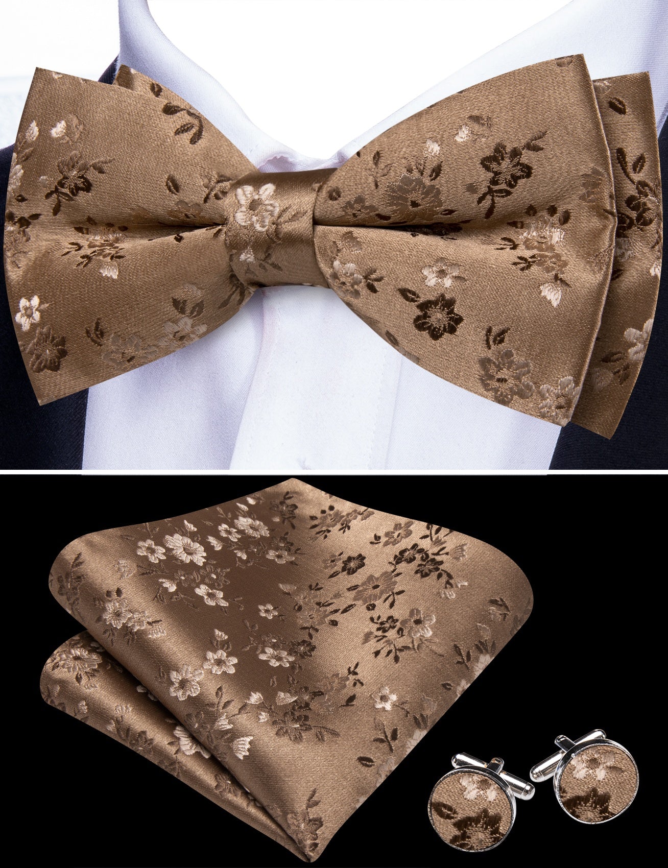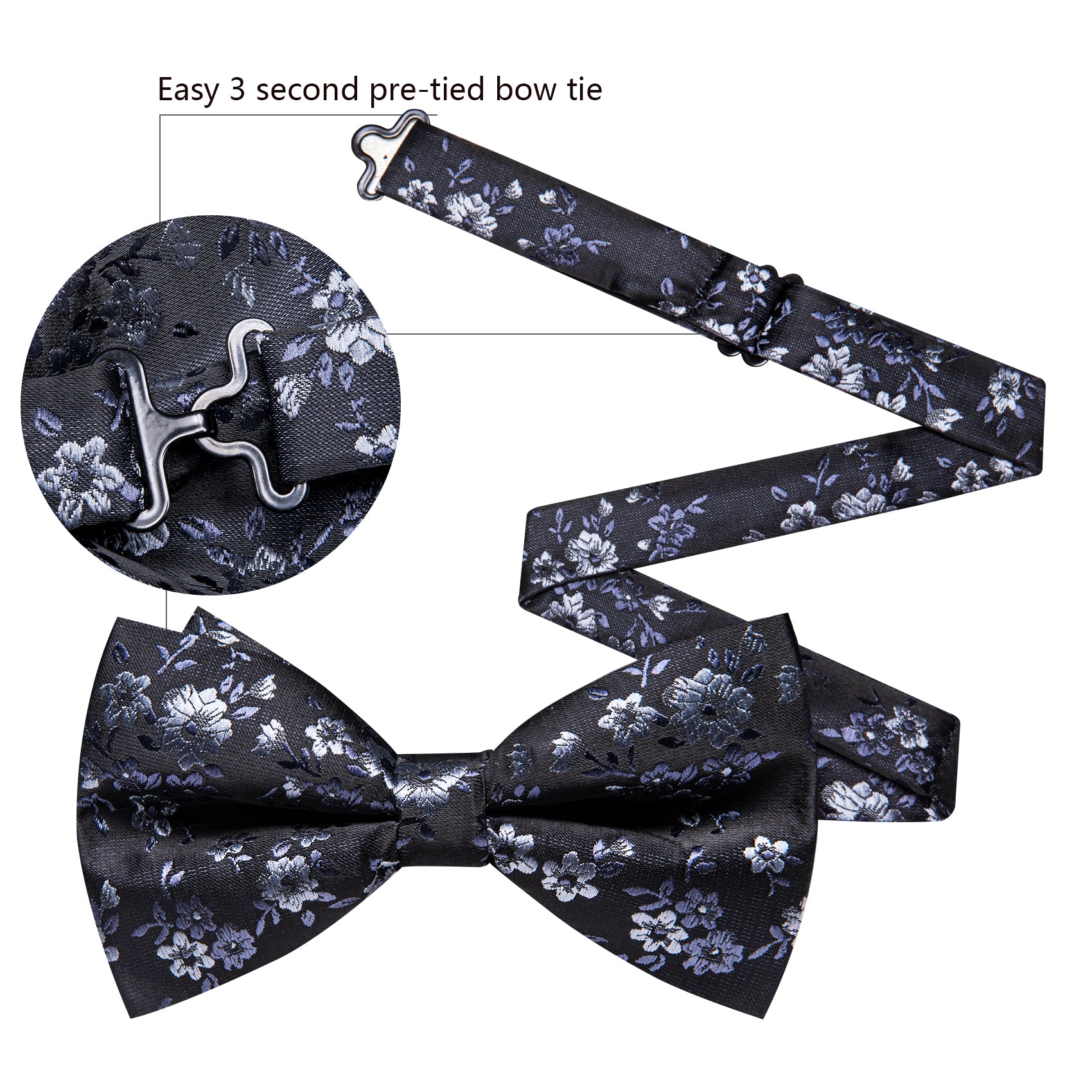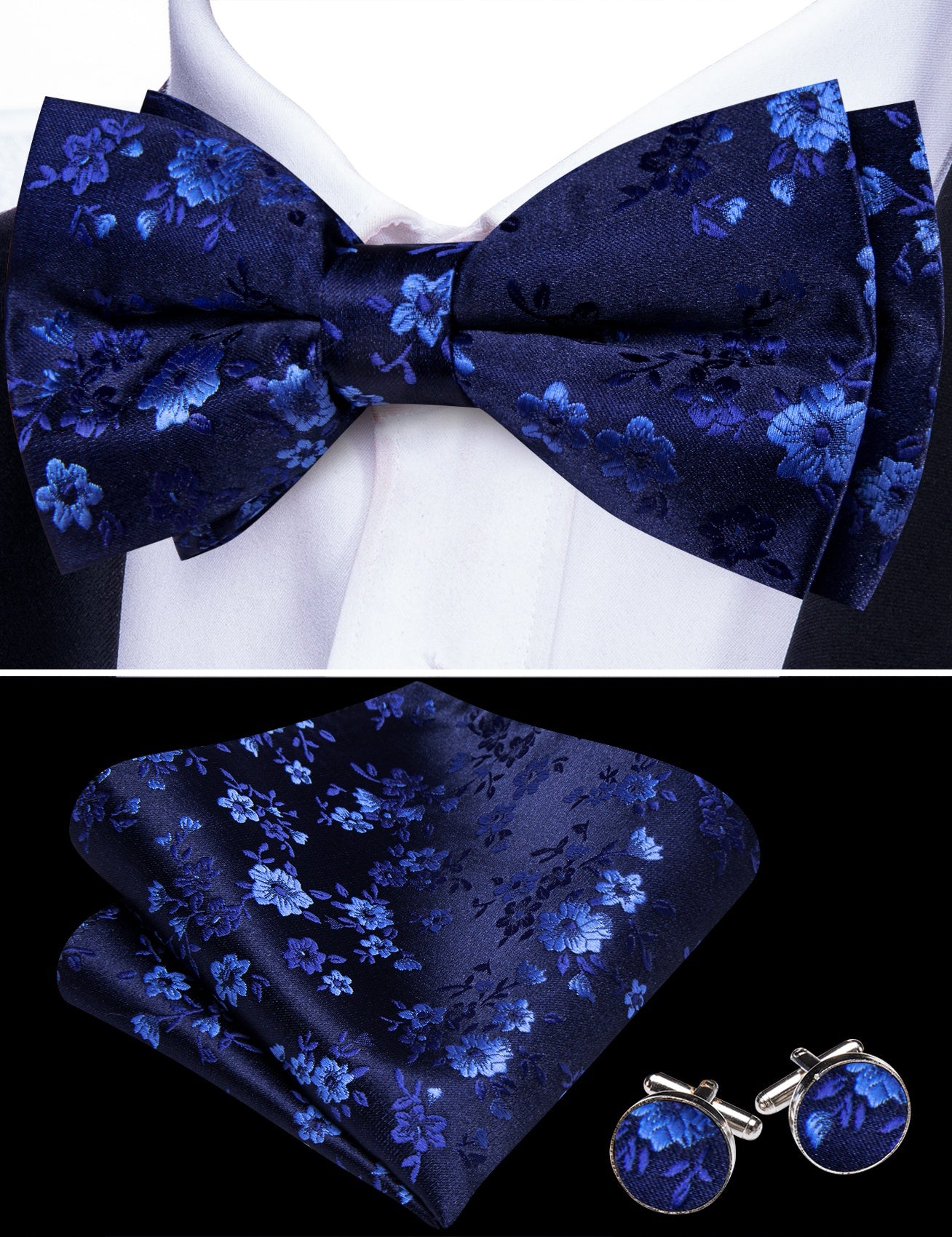 Barry. Wang Black Silver Bowtie for Wedding Party Pre-tied Floral Silk Bowtie Pocket Square Cufflinks Set