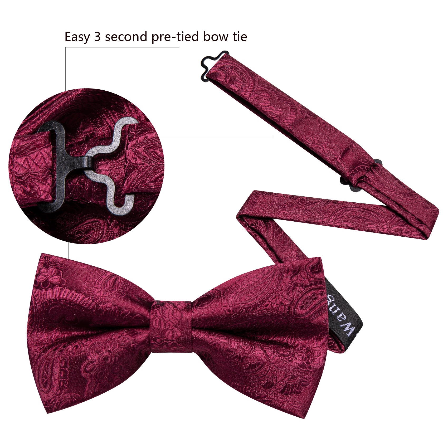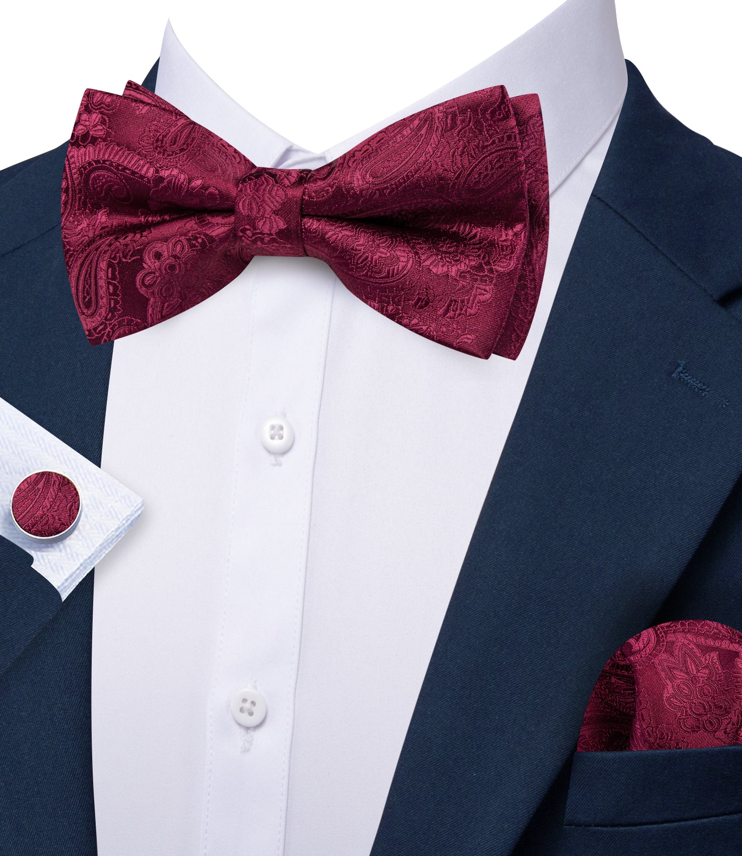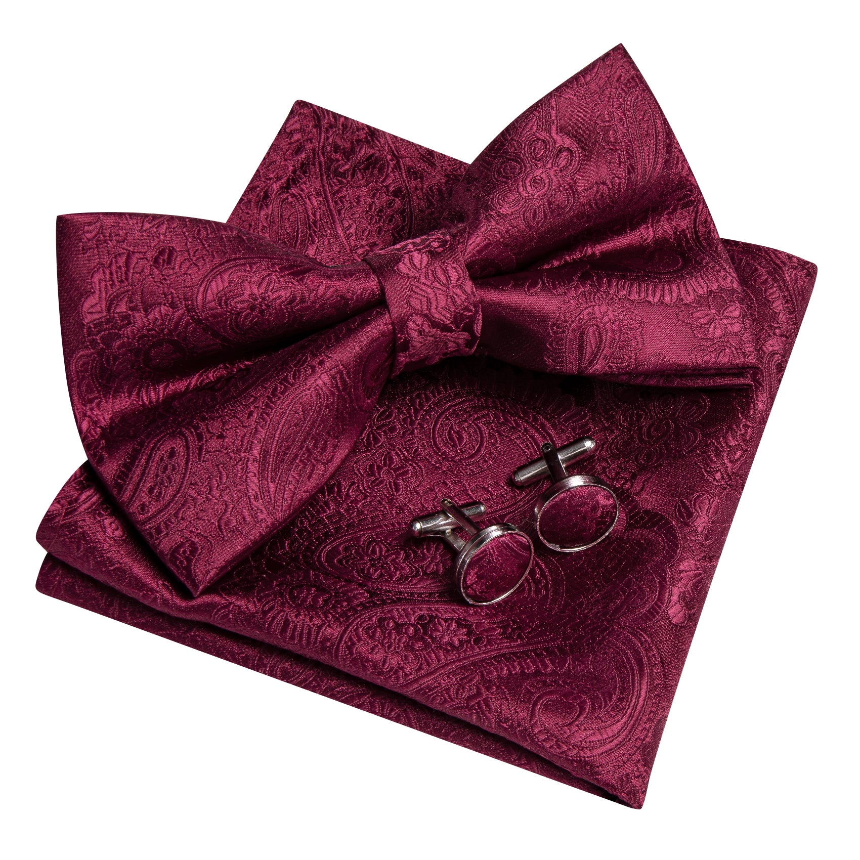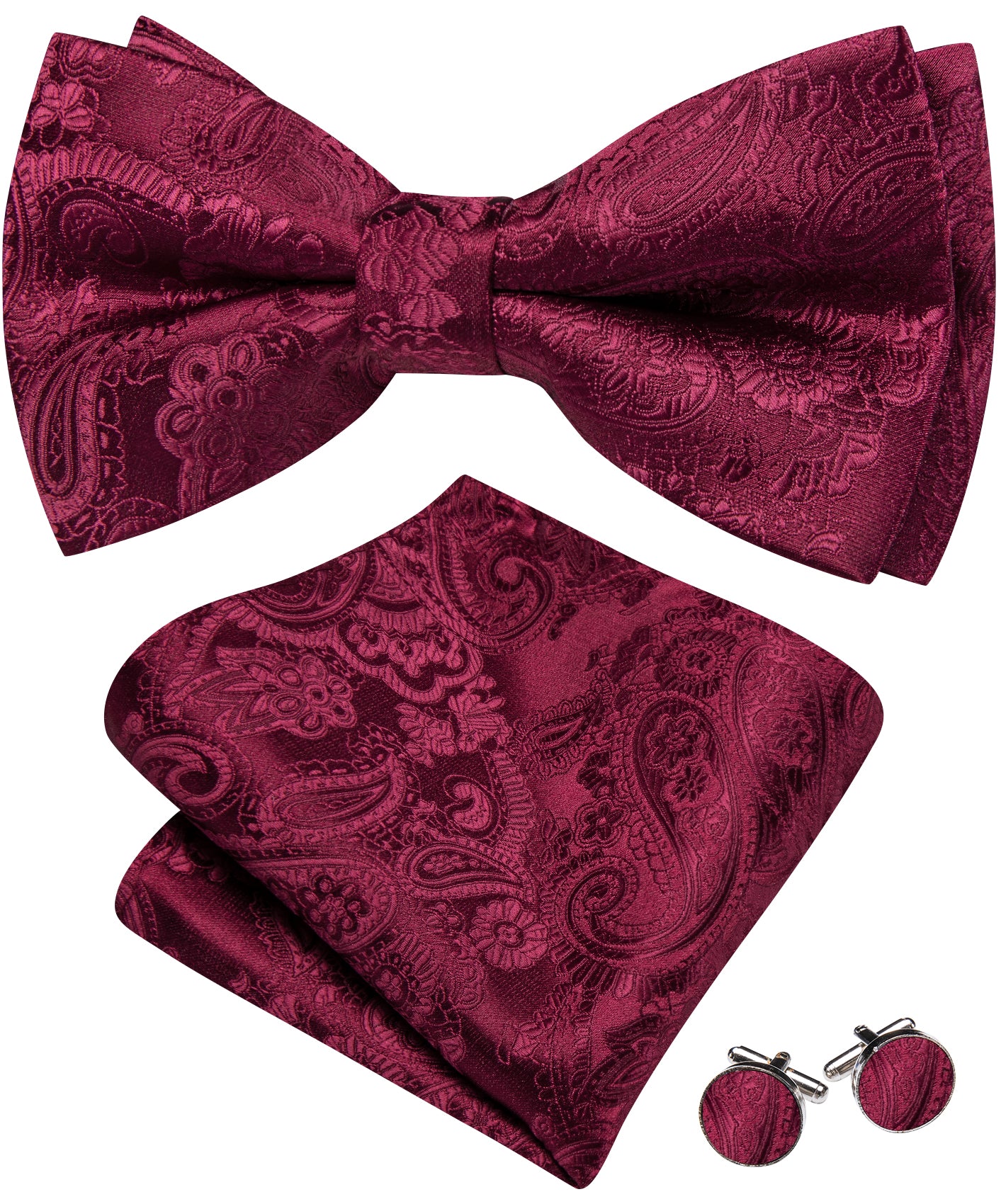 Barry. Wang Burgundy Paisley Bowtie for Wedding Adjustable Pre-tied Jacquard Bow Tie Hanky Cufflinks Set