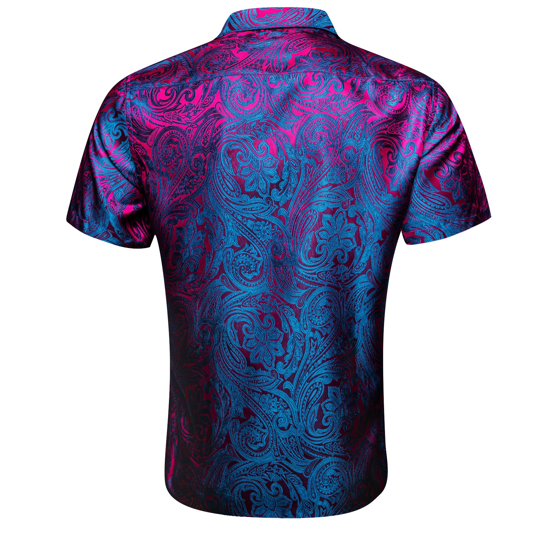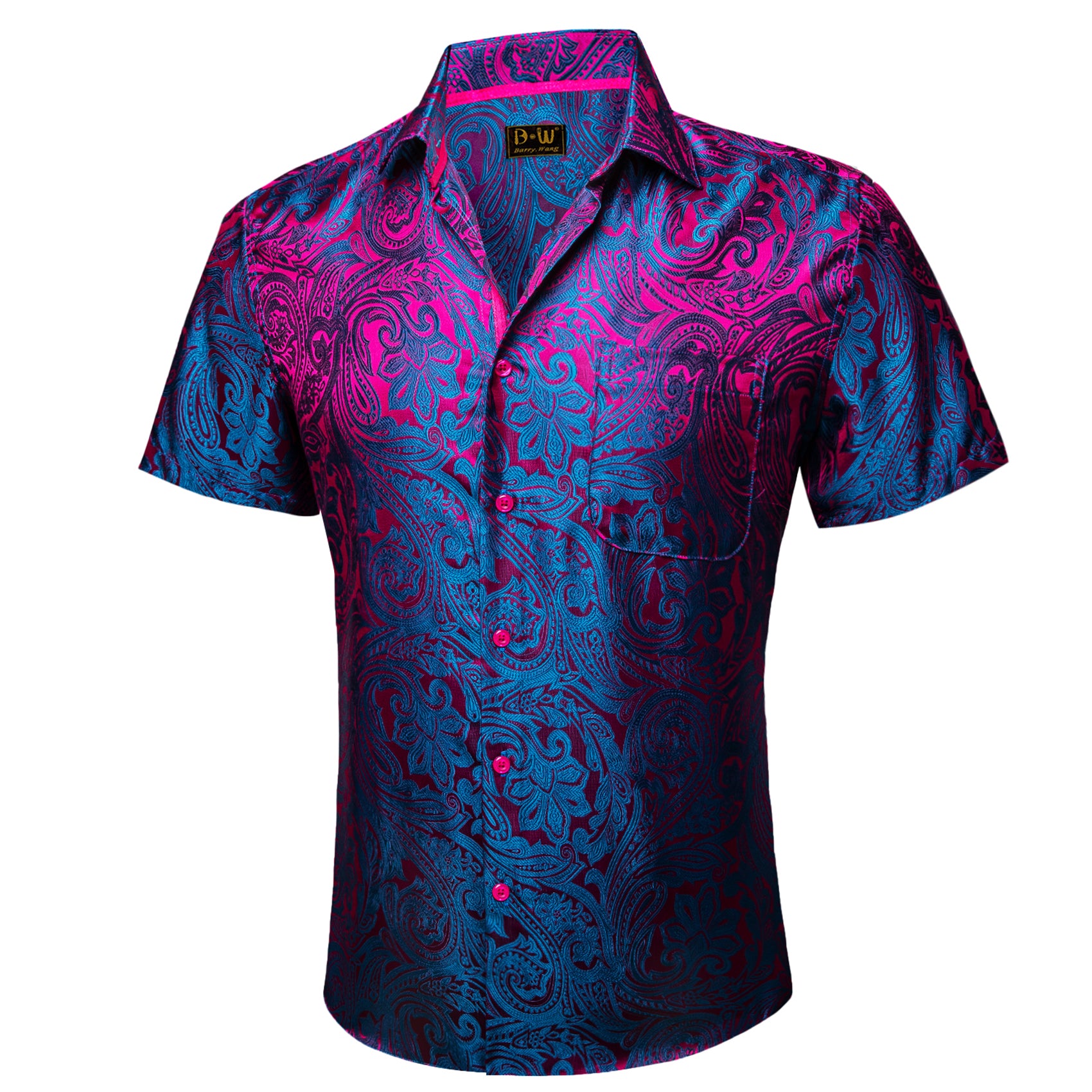 Barry. Wang Blue Purple Paisley Jacquard Short Sleeve Button Up Shirt for Men