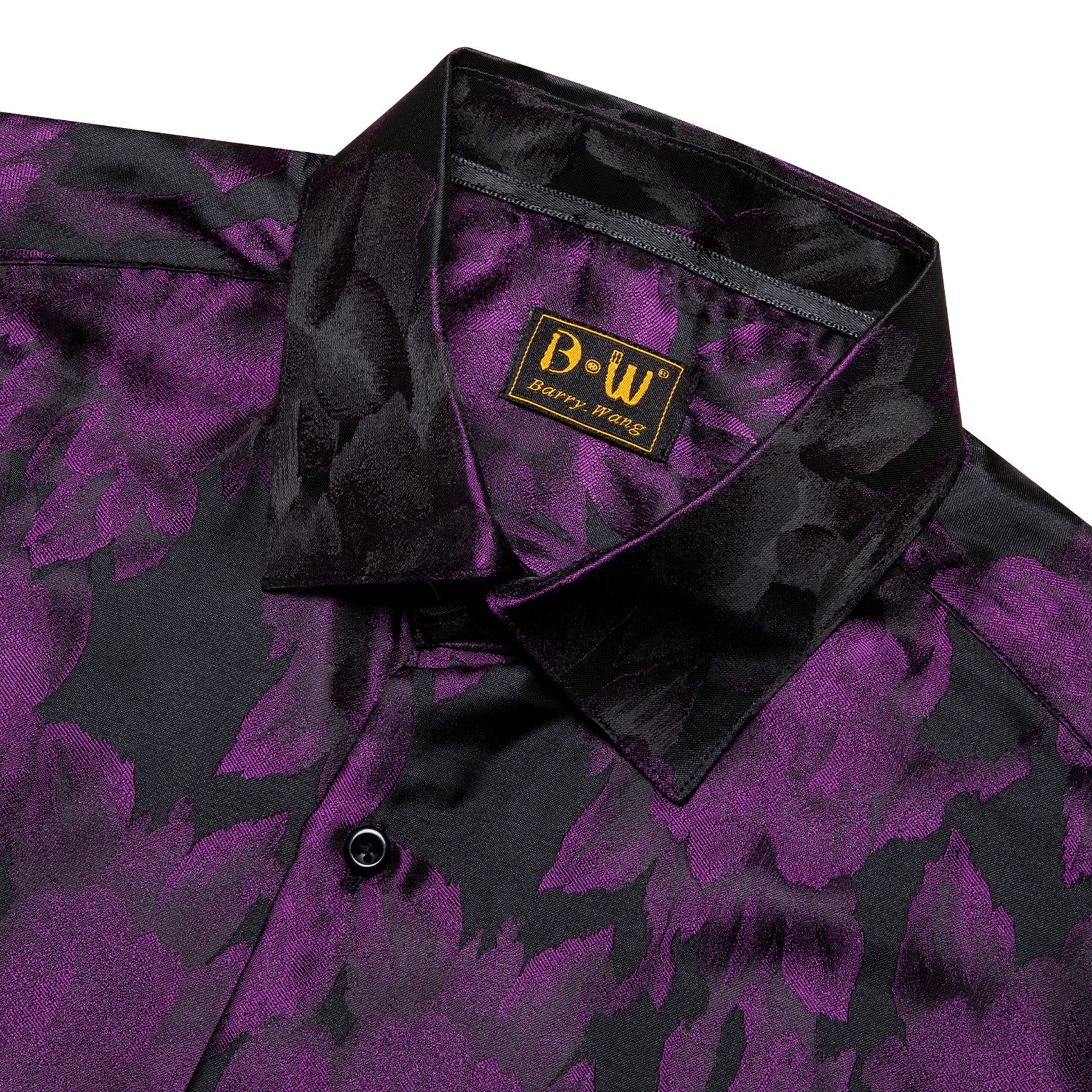 Barry. Wang Purple Black Floral Jacquard Short Sleeve Button Up Shirt for Men