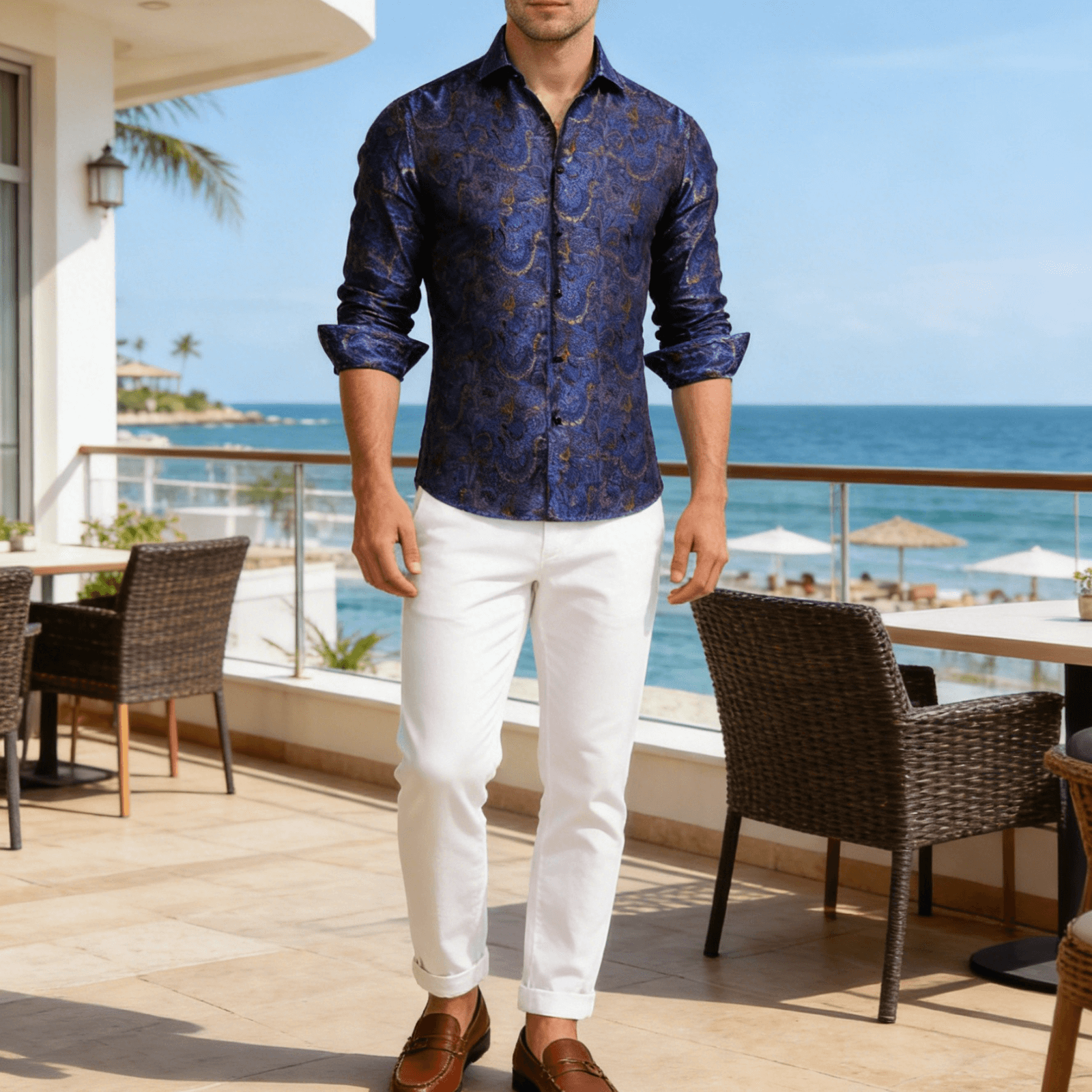 Barry. Wang Mens Paisley Dress Shirt Navy Blue 70s Disco Long Sleeve Button Down Shirt