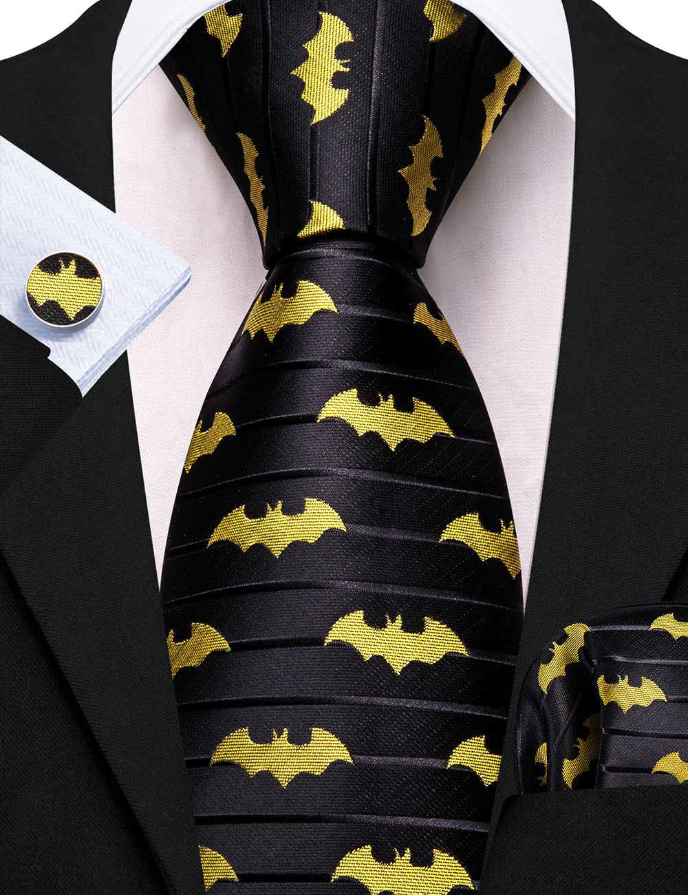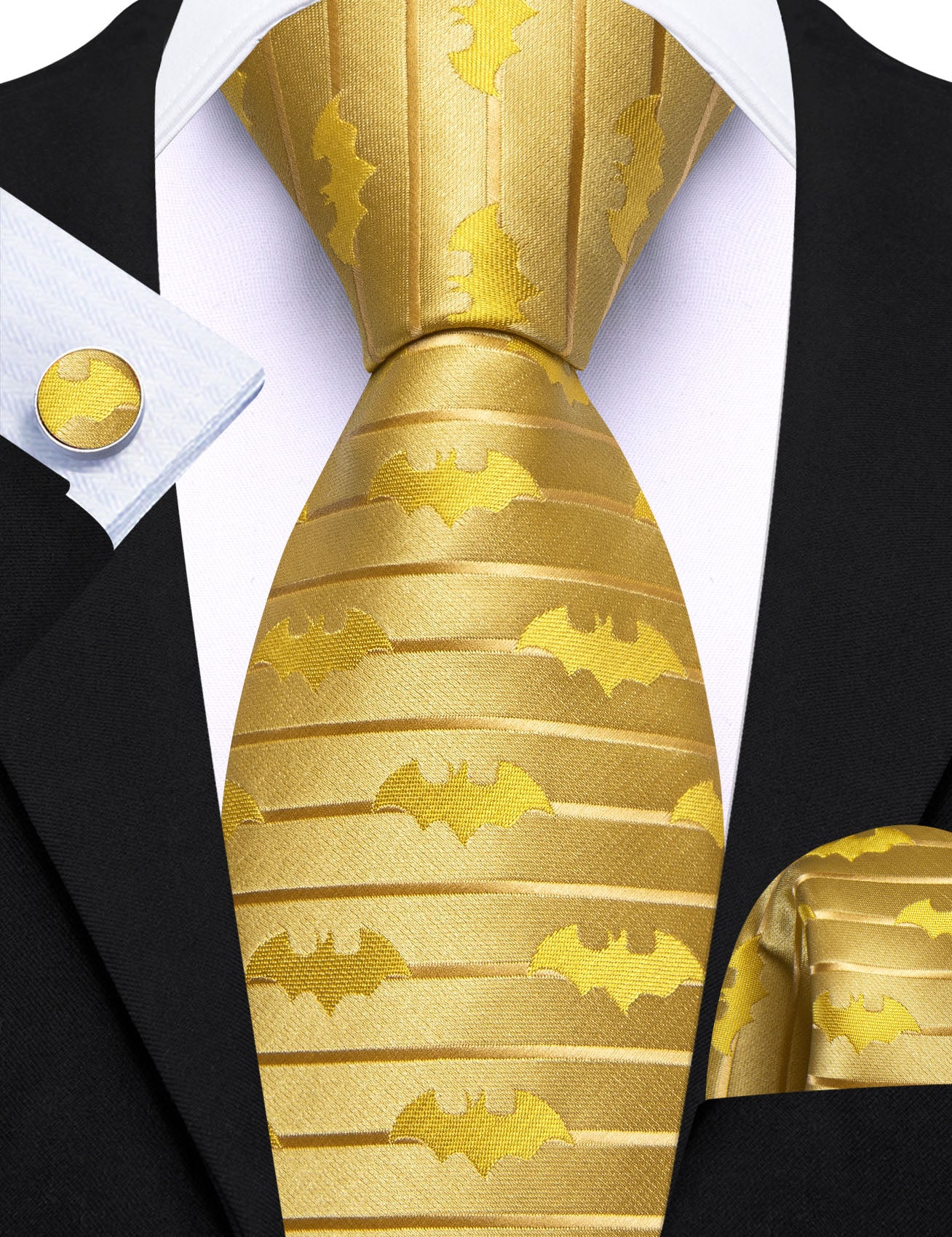 Barry. Wang Yellow Bat Tie Black Silk Necktie Handkerchief Cufflinks Set for Party