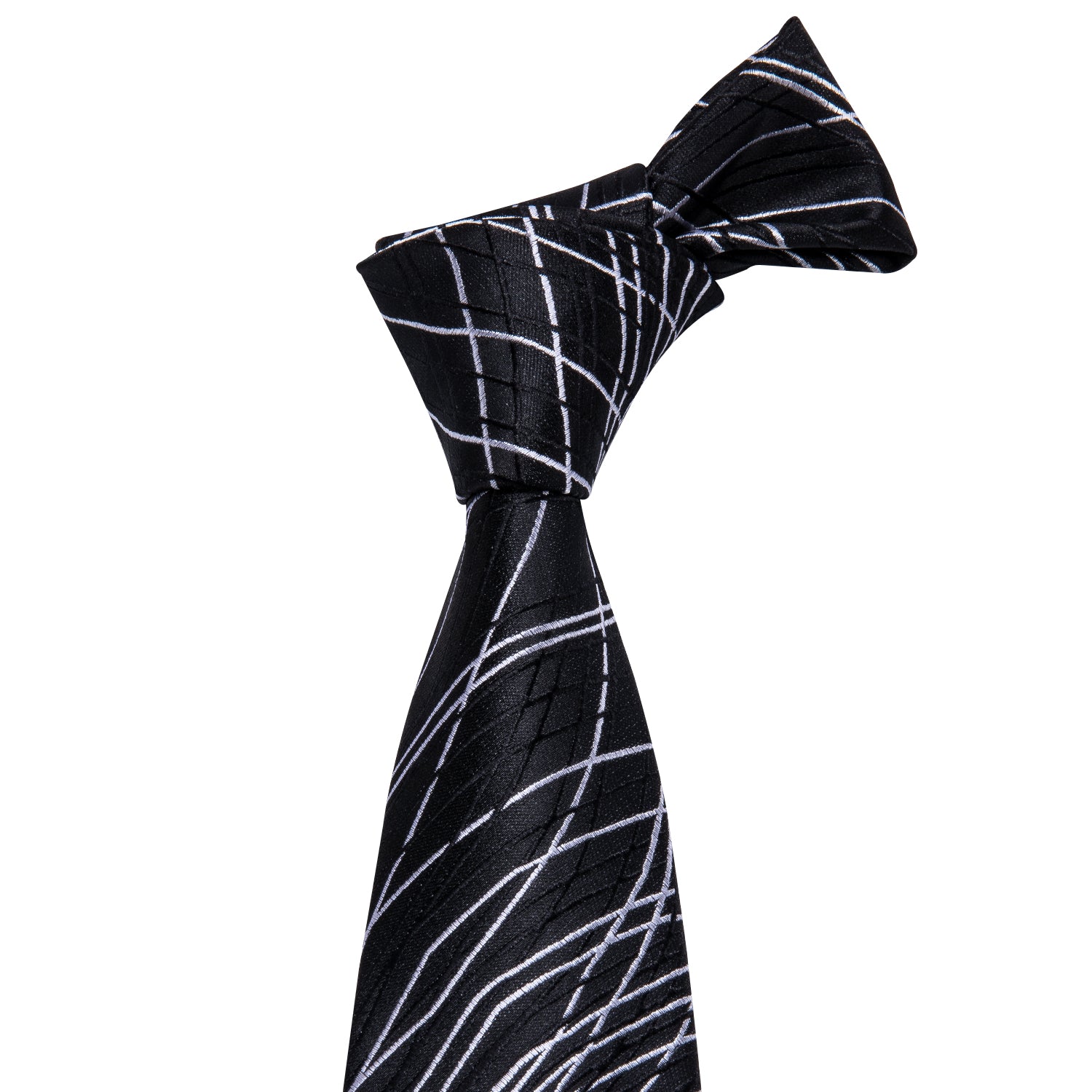 Barry. Wang Silk Black Tie White Line Novelty Silk Necktie Hanky Cufflinks Set for Men Business
