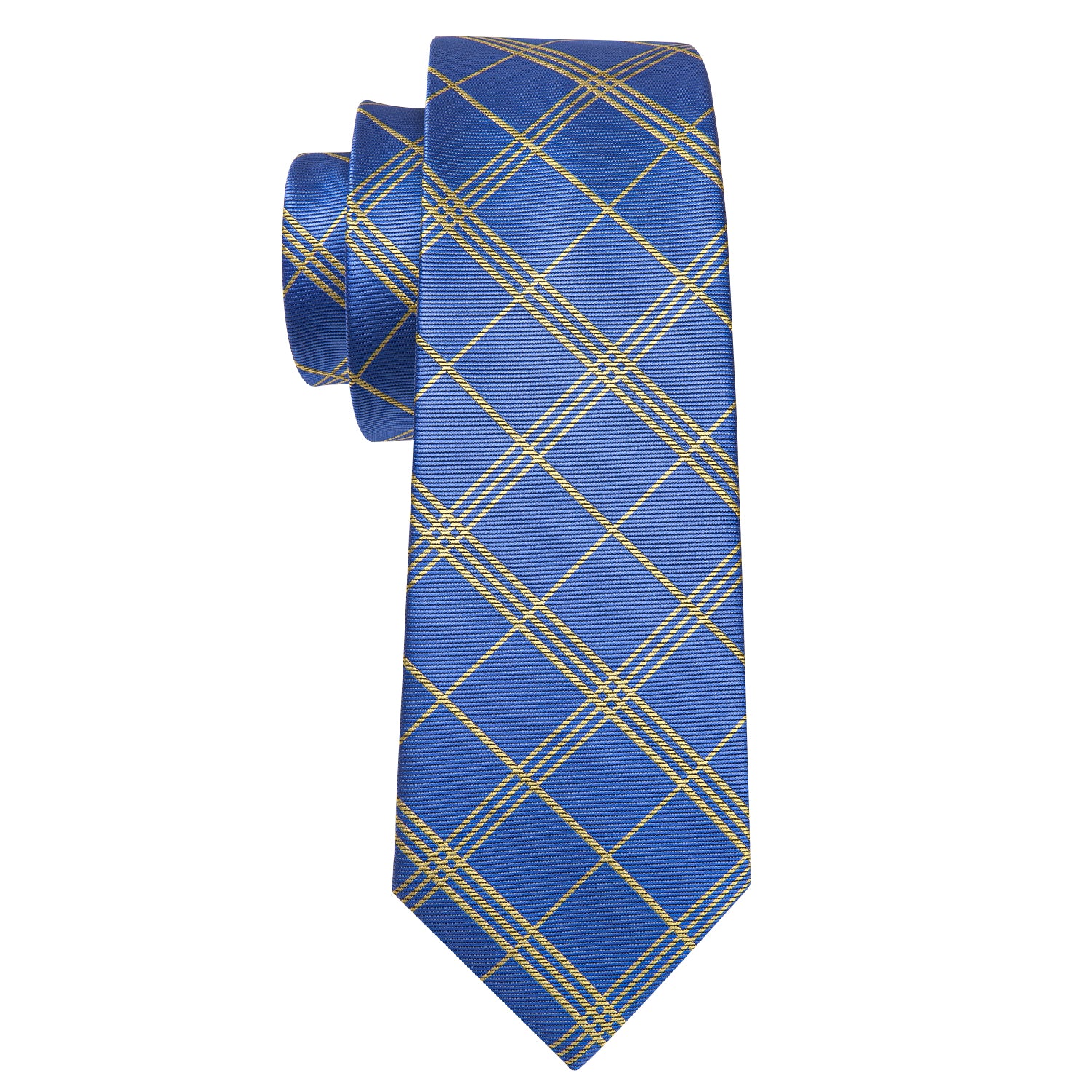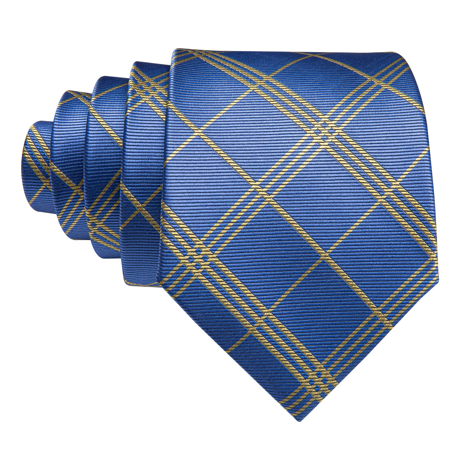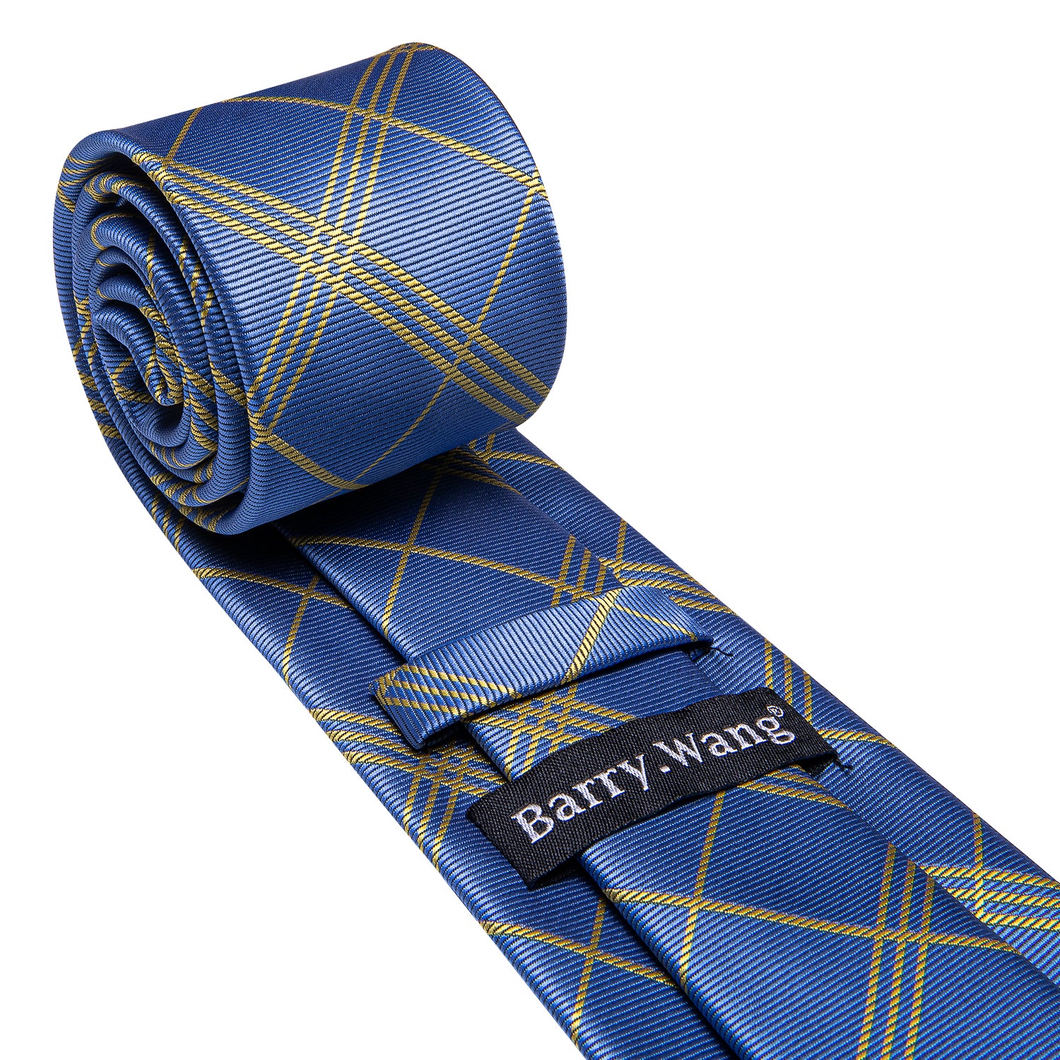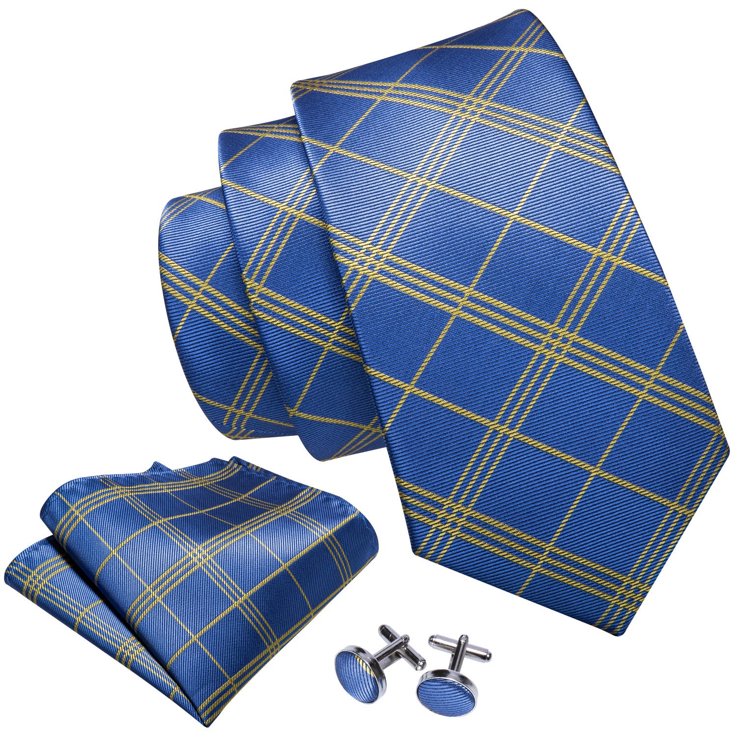 Barry. Wang Light Blue Yellow Stripe Plaid Tie Pocket Square Cufflinks Set