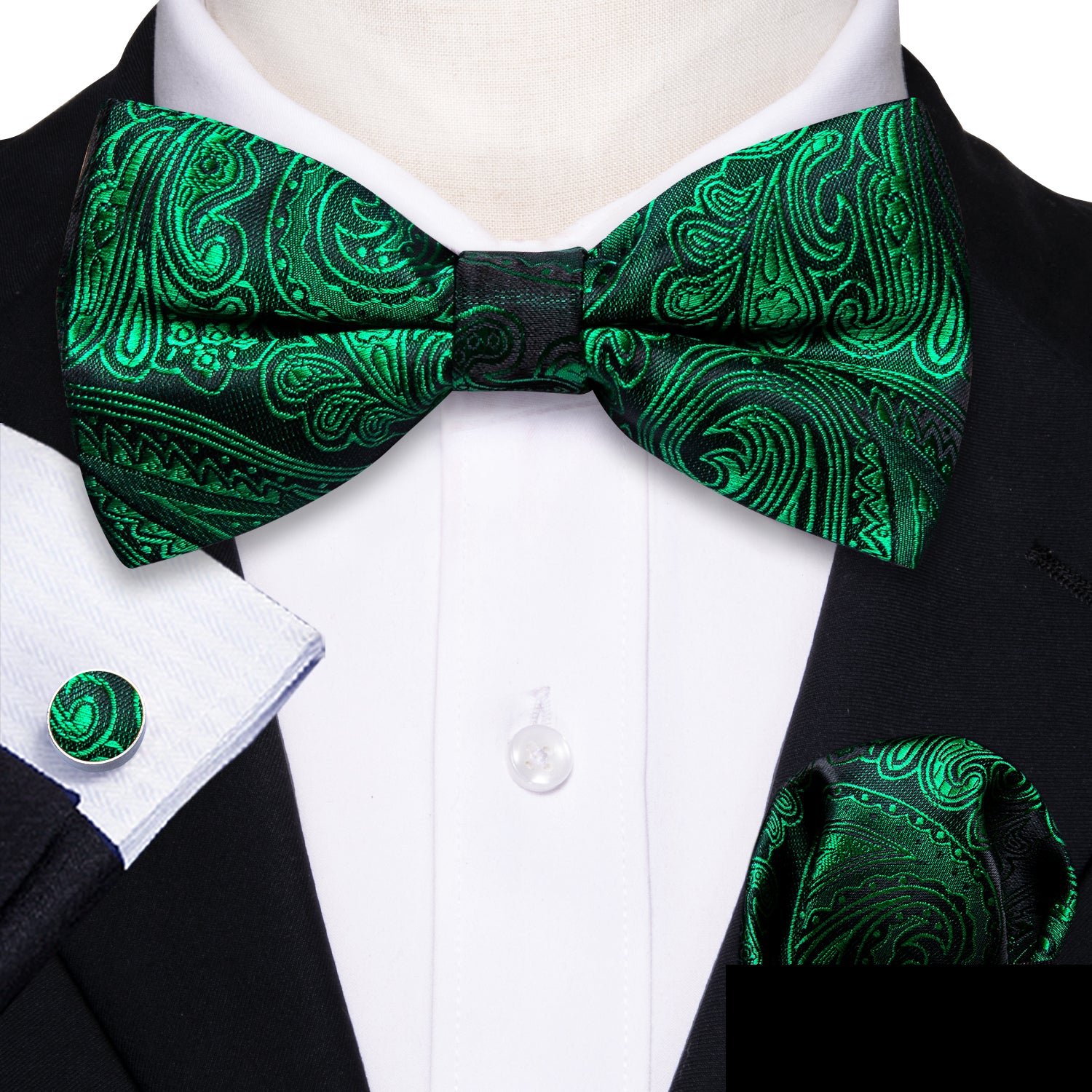 Barry. Wang Emerald Green Bow Tie Paisley Silk Pre-tied Jacquard Bow Tie Pocket Square Cufflinks Set