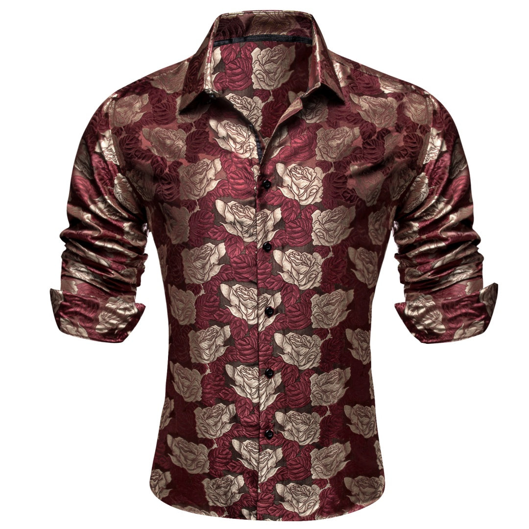 Barry. Wang Gold Floral Button Up Shirt Casual Burgundy Silk Long Sleeve Dress Shirt