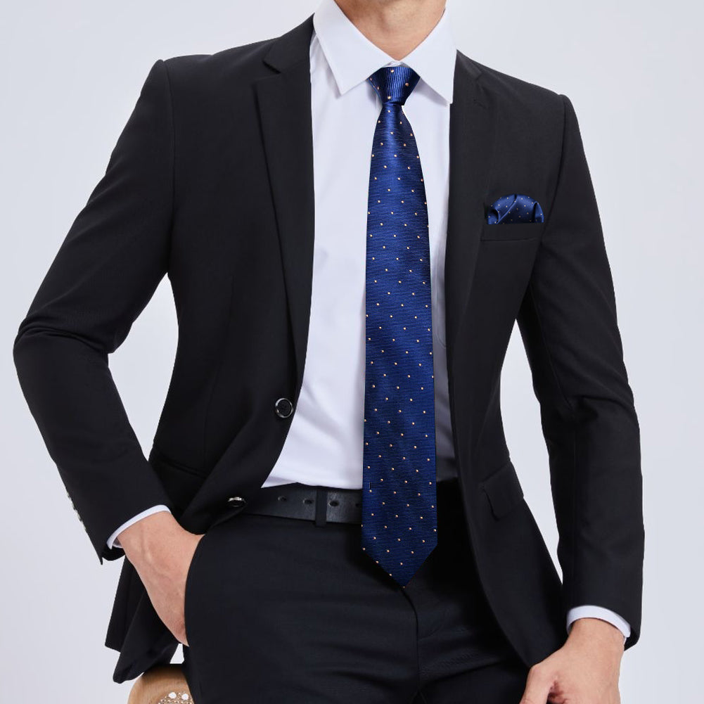 Barry. Wang Navy Blue Necktie Polka Dot Silk Tie Hanky Cufflinks Set for Men Business