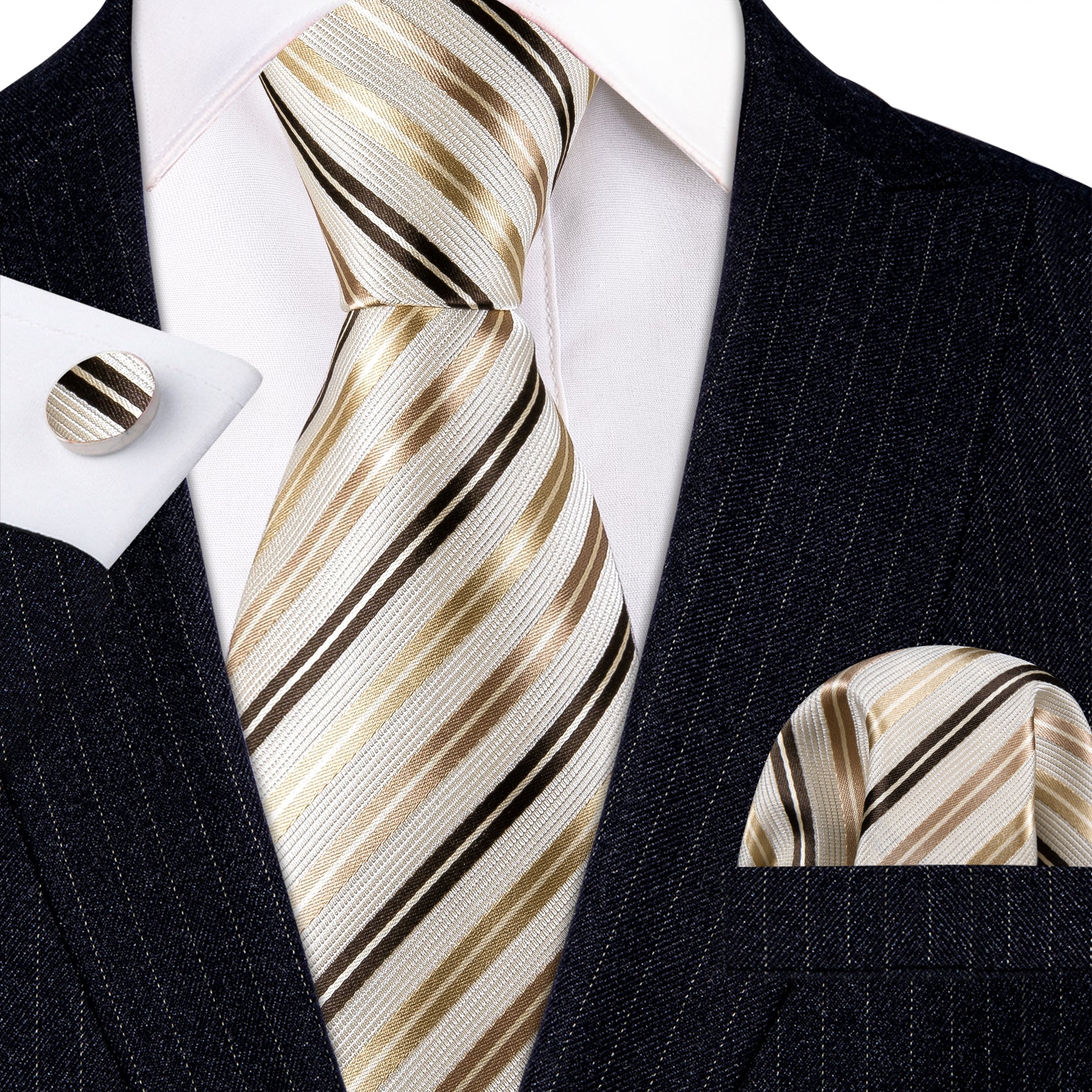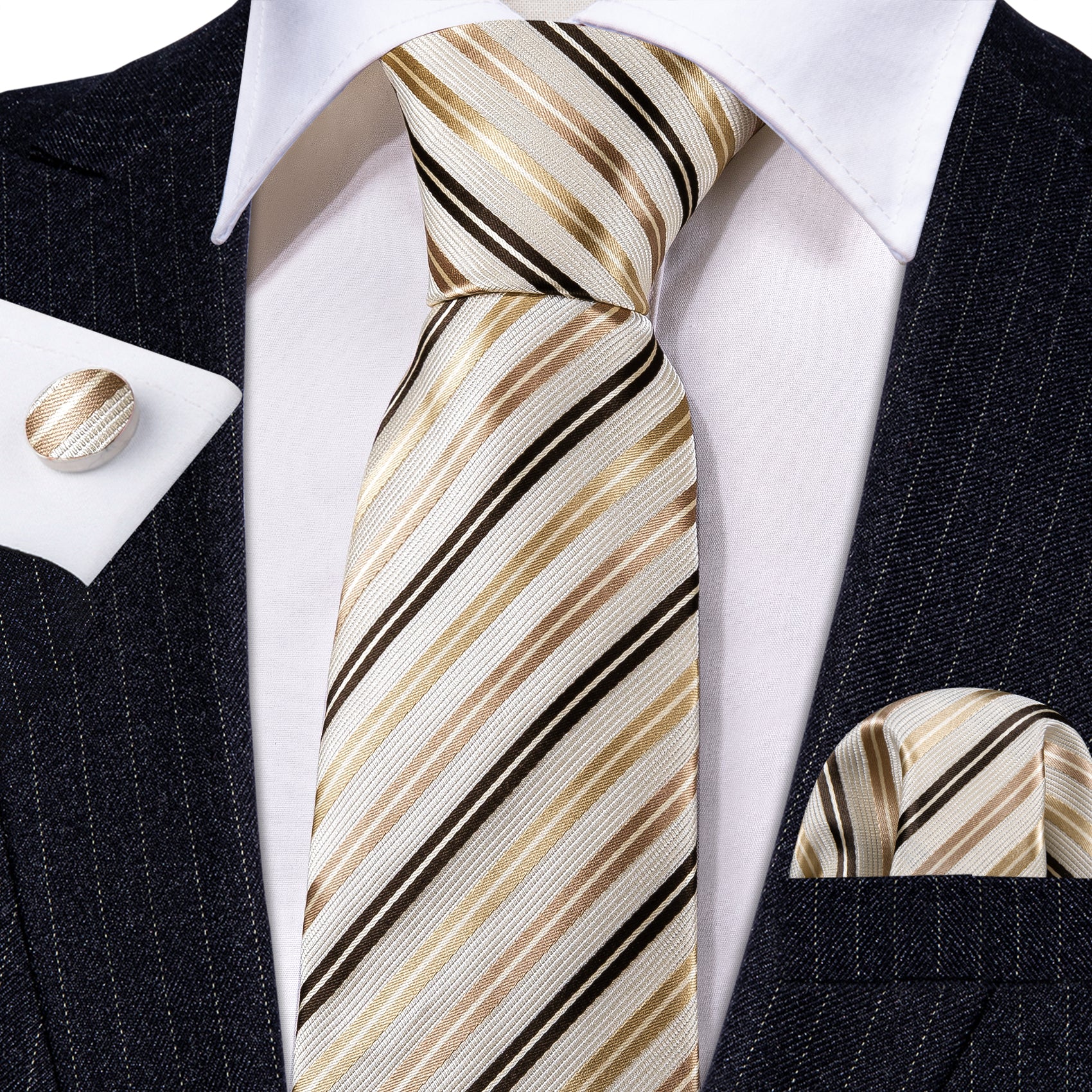 Barry. Wang Silk Striped Tie Champagne Gold Brown Necktie Pocket Square Cufflinks Set for Men Business