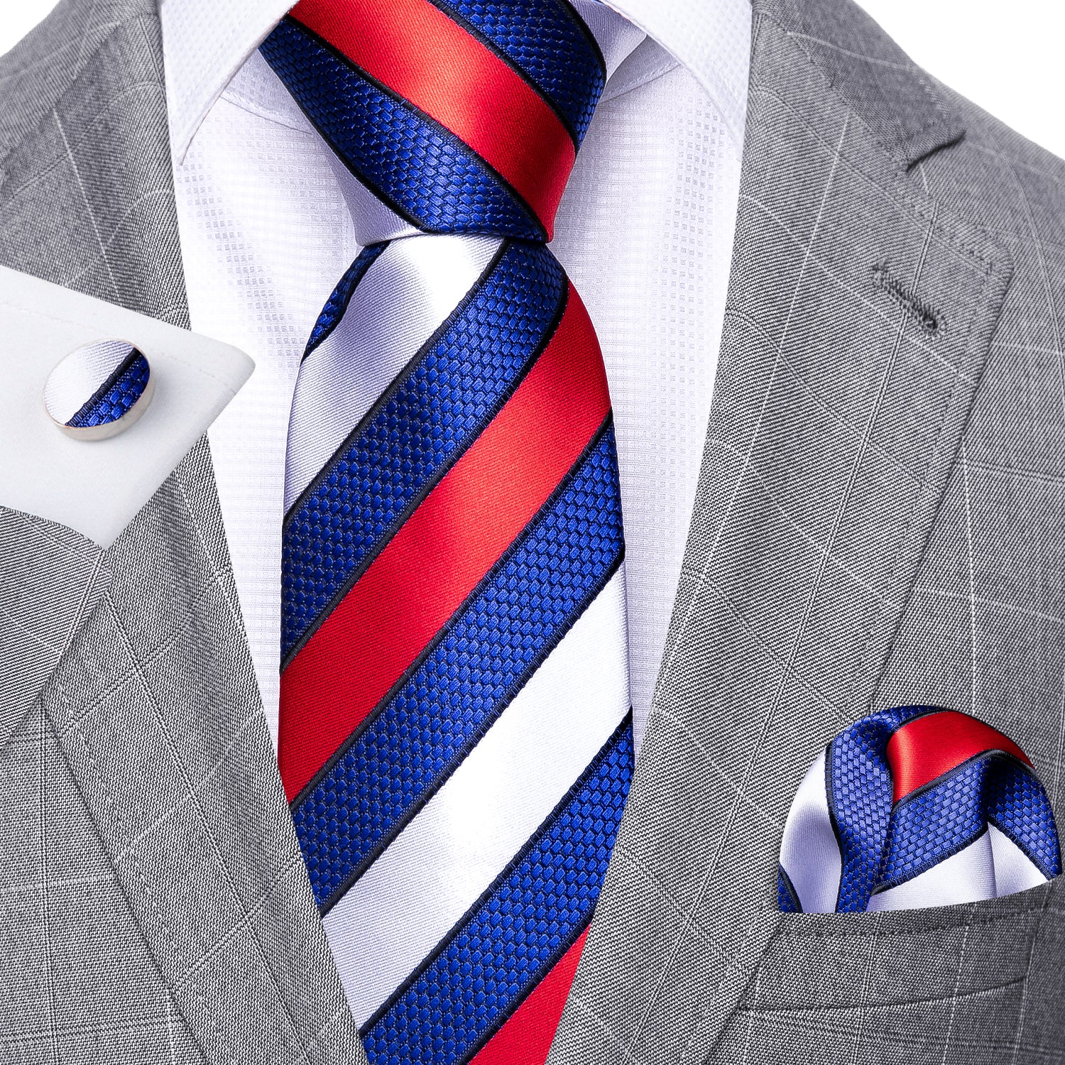 Men Tie Red White Blue Striped Silk Tie Hanky Cufflinks SetMen Tie Red White Blue Striped Silk Tie Hanky Cufflinks Set