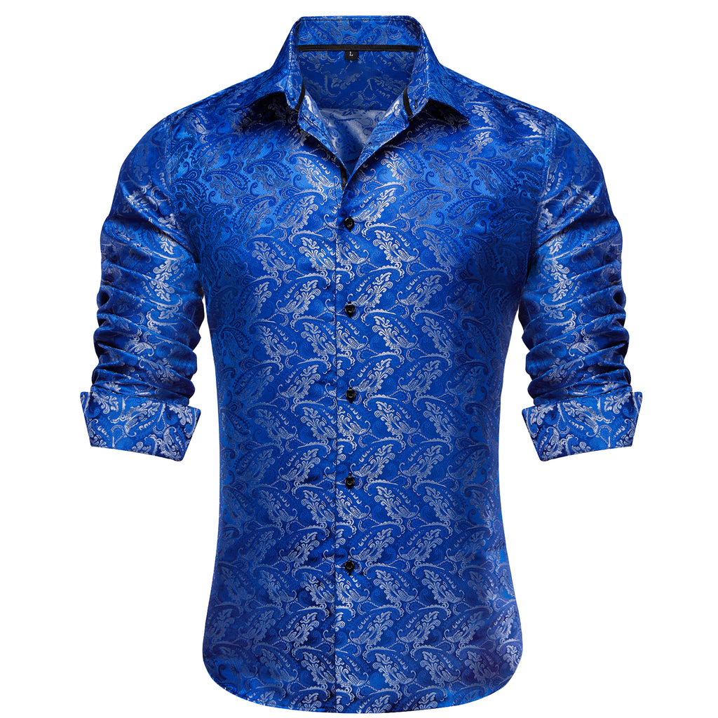 Barry.Wang 2pcs Mens Shirts Black Blue Paisley Shirt Silk Shirt