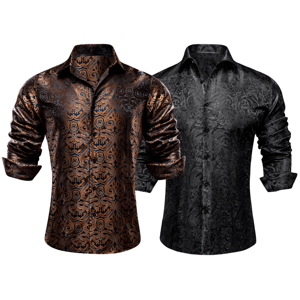 Barry.Wang 2pcs Mens Shirts Brown Black Paisley Shirt Silk Shirt