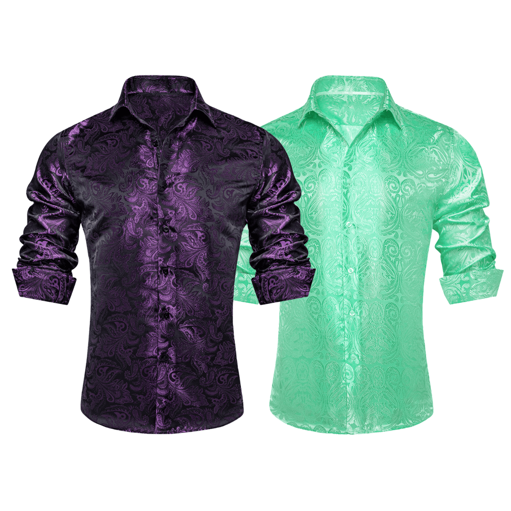 Barry.Wang 2pcs Mens Shirts Purple Green Paisley Floral Shirt Silk Shirt