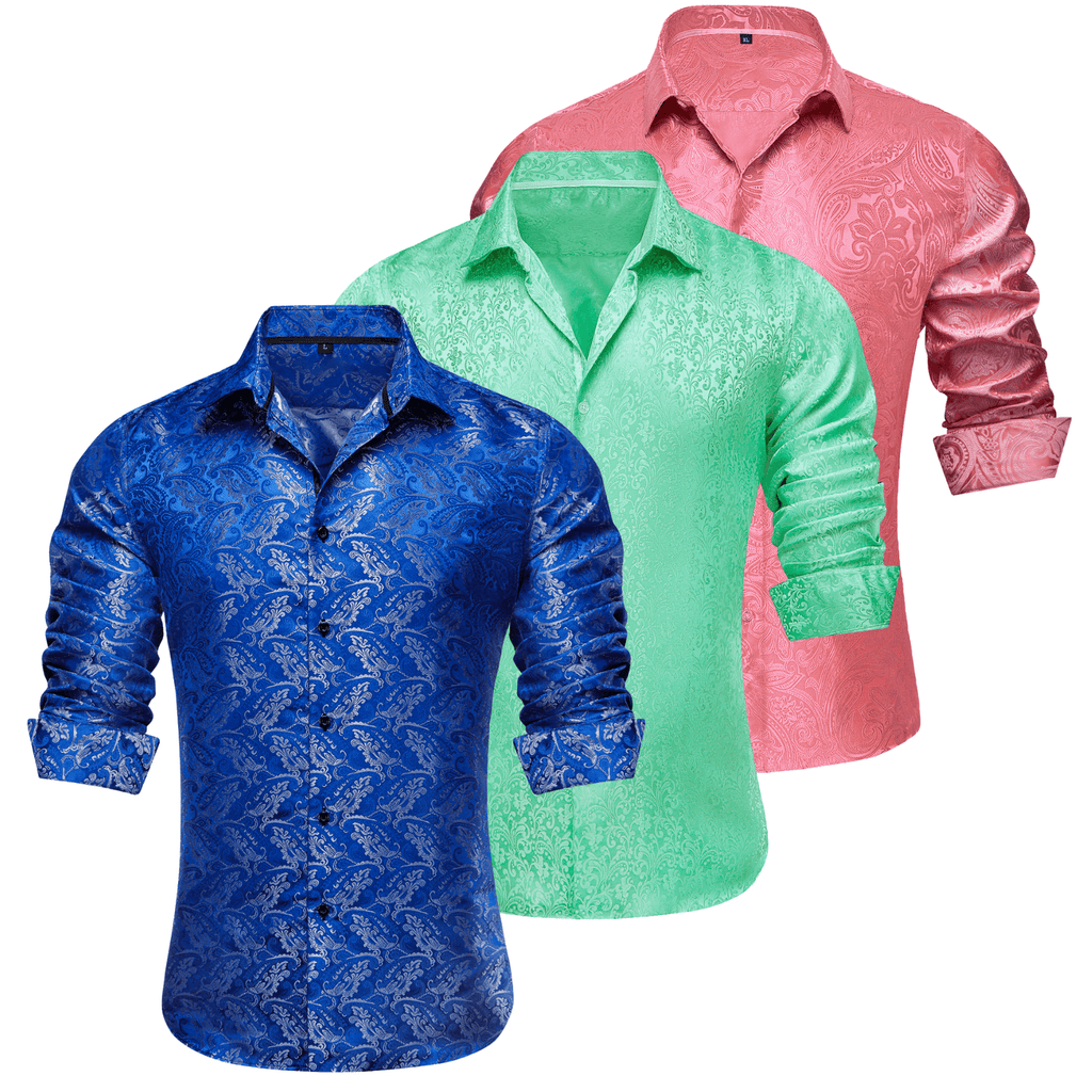 Barry.Wang 3pcs Mens Dress Shirts Blue Green Pink Paisley Shirt Silk Shirt