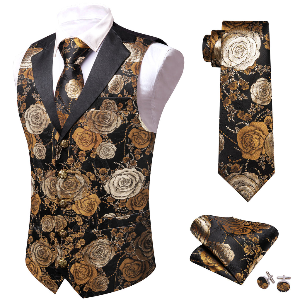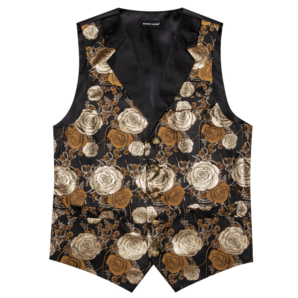 Barry. Wang Beige Golden Brown Floral Suit Vest V-neck Wedding Dress Waistcoat Tie Pocket Square Set