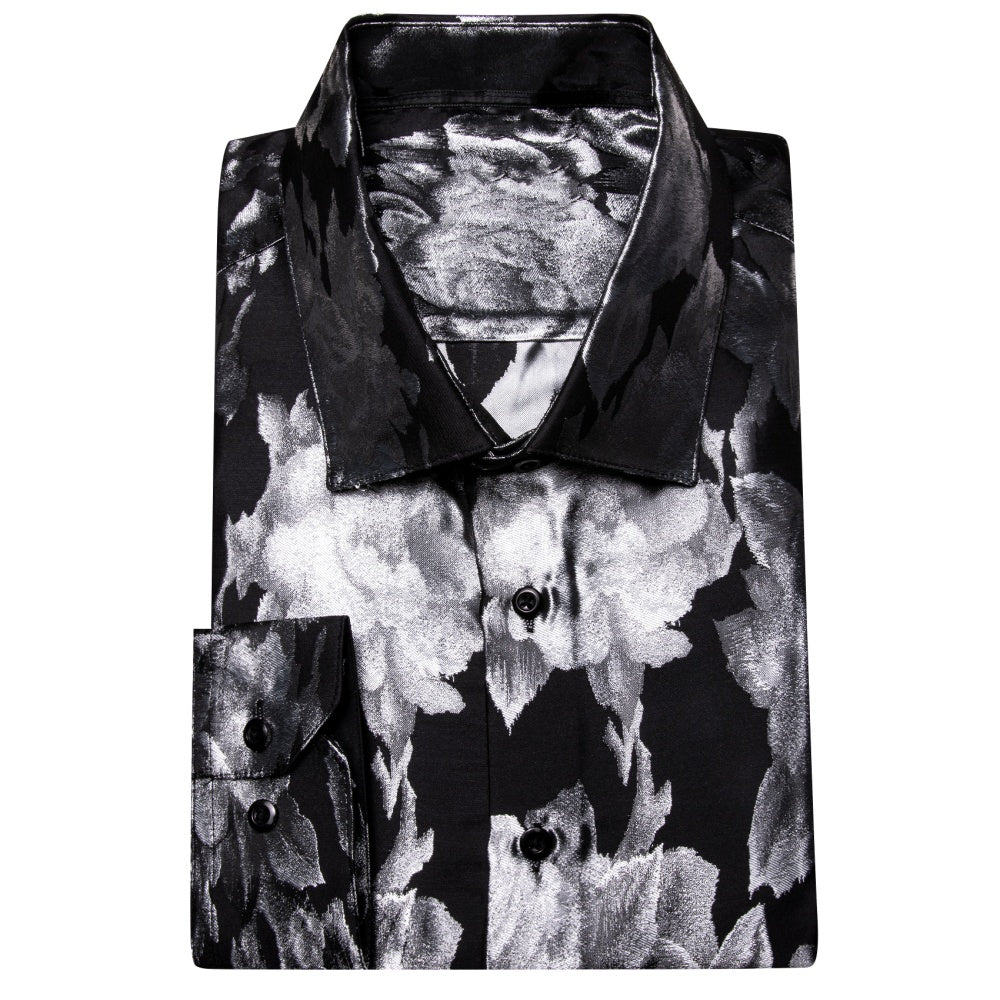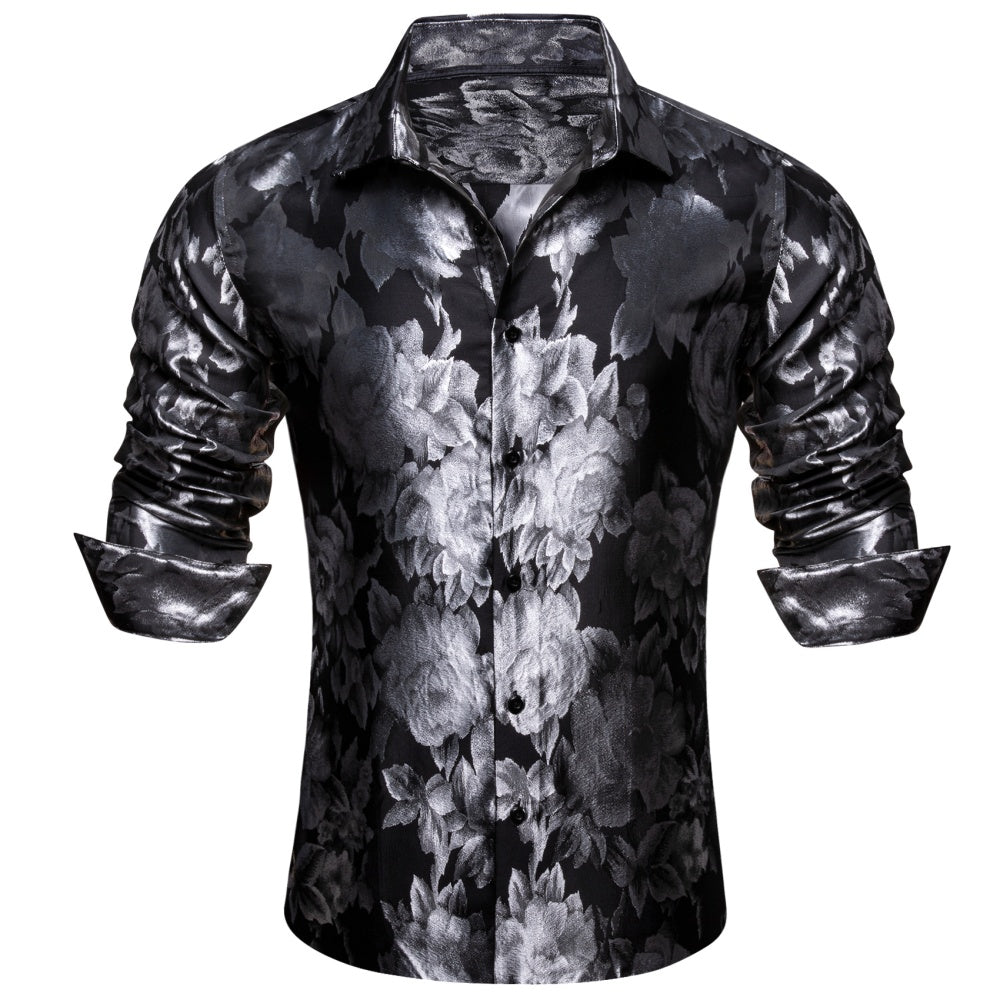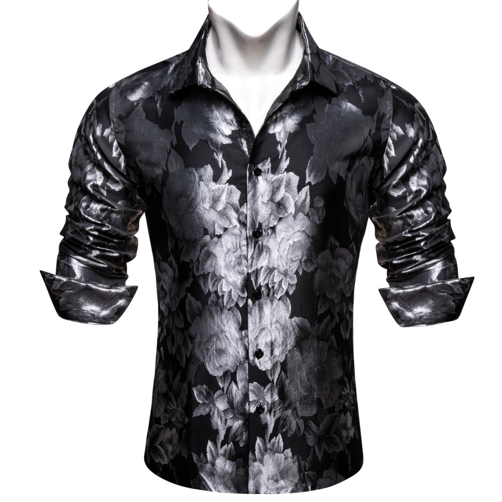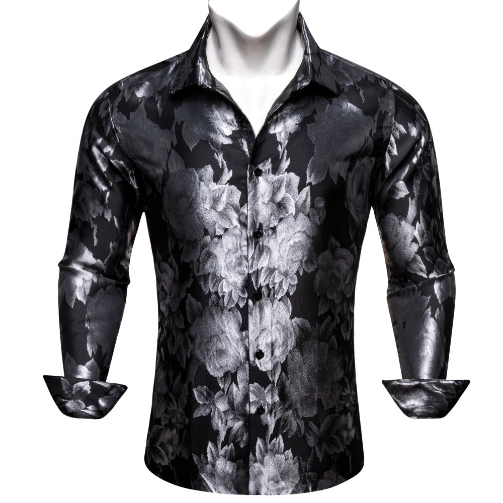 Barry. Wang Black Grey Floral Long Sleeve Shirt Button Up Shirt For Men