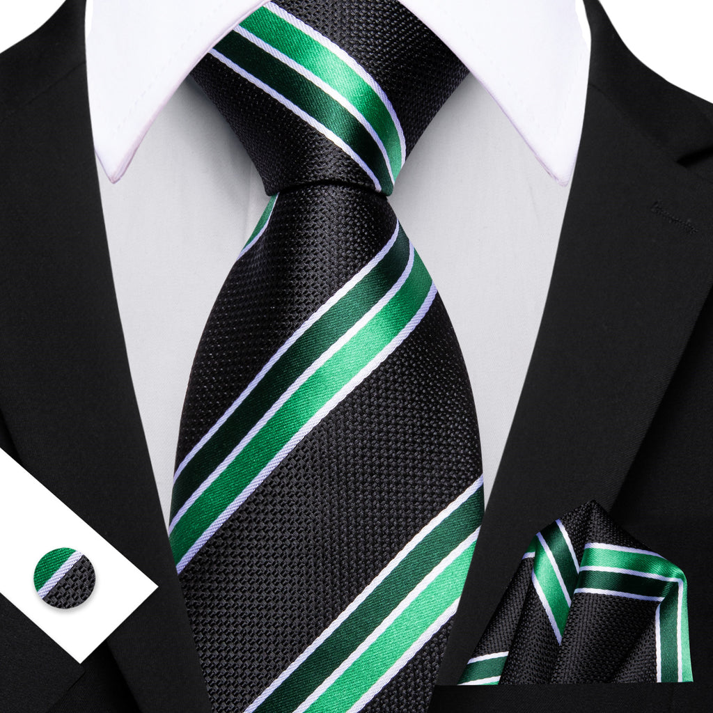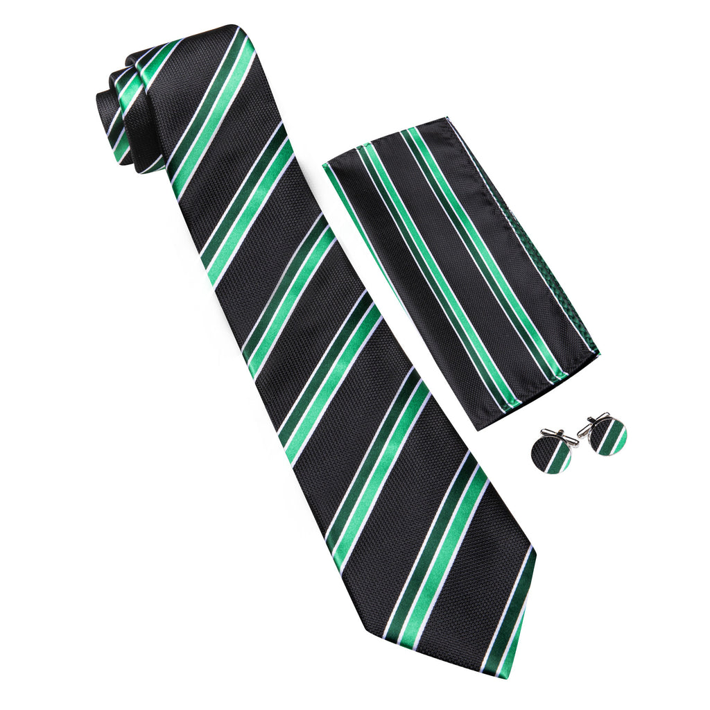 Barry. Wang Black Necktie Green Striped Tie Silk Necktie Pocket Square Cufflinks Set