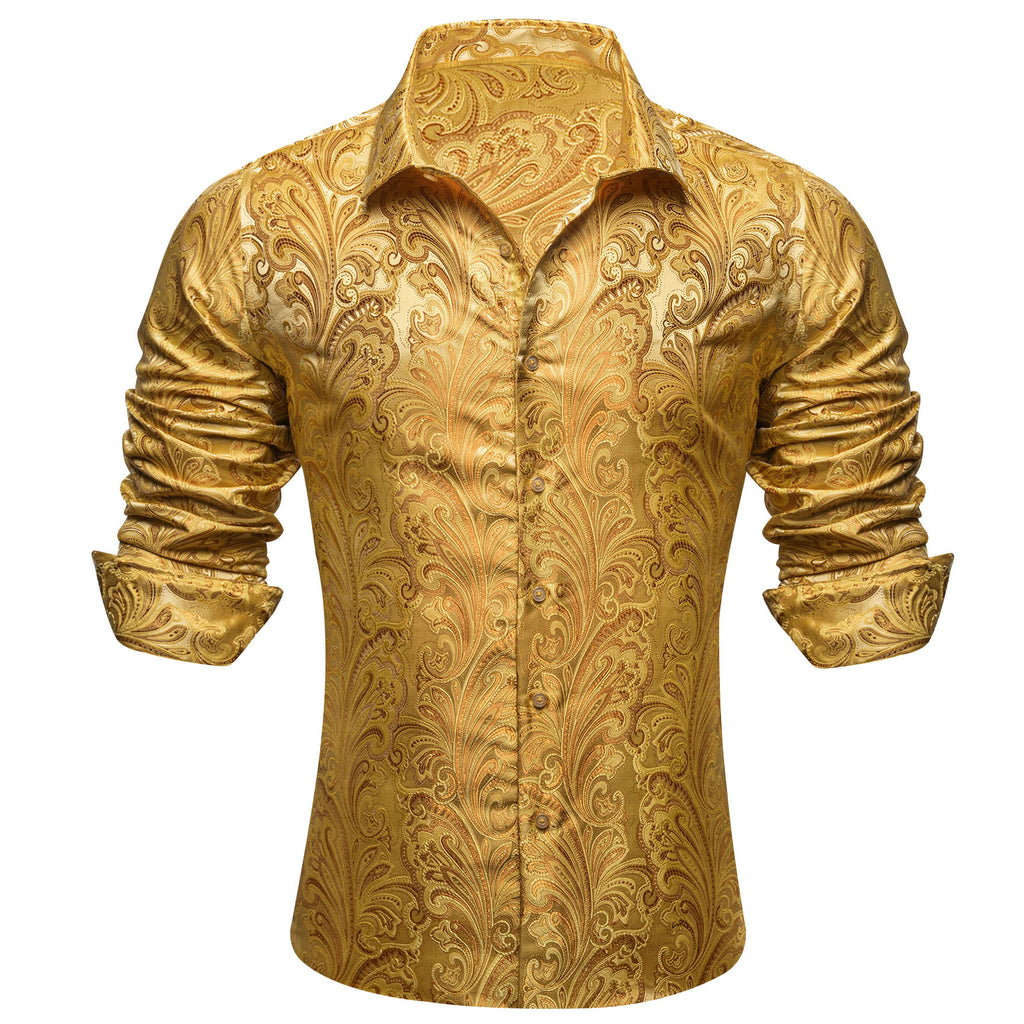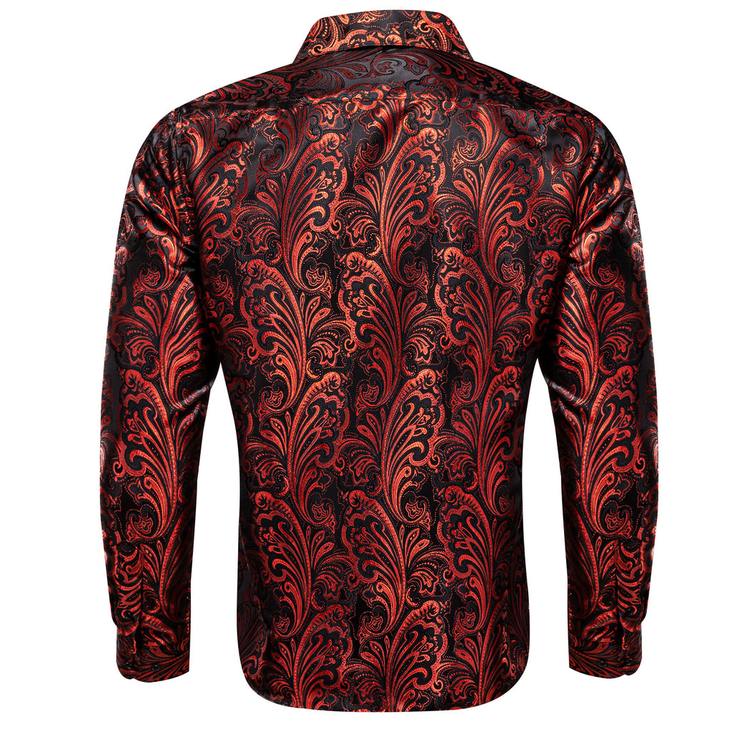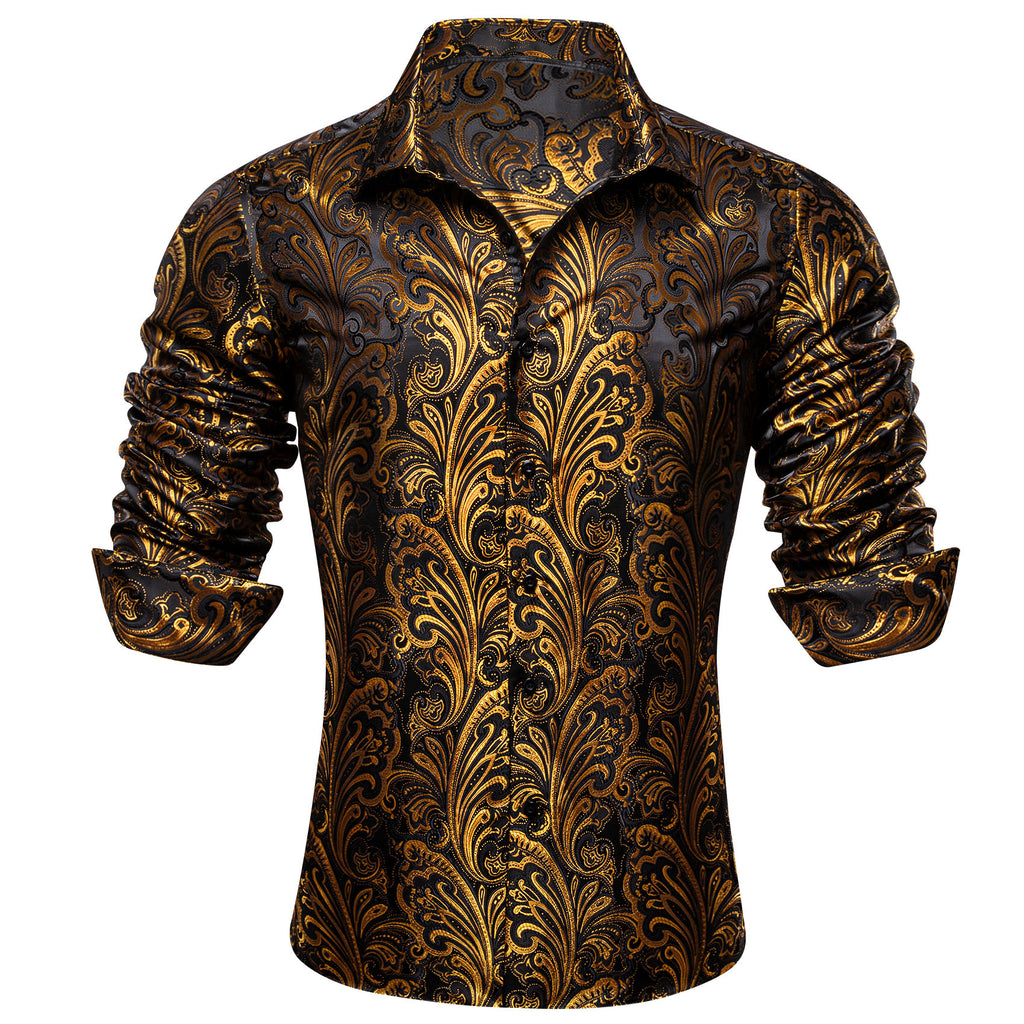 Barry. Wang Black Orange Floral Shirt Silk Long Sleeve Collar Dress Shirt For Men