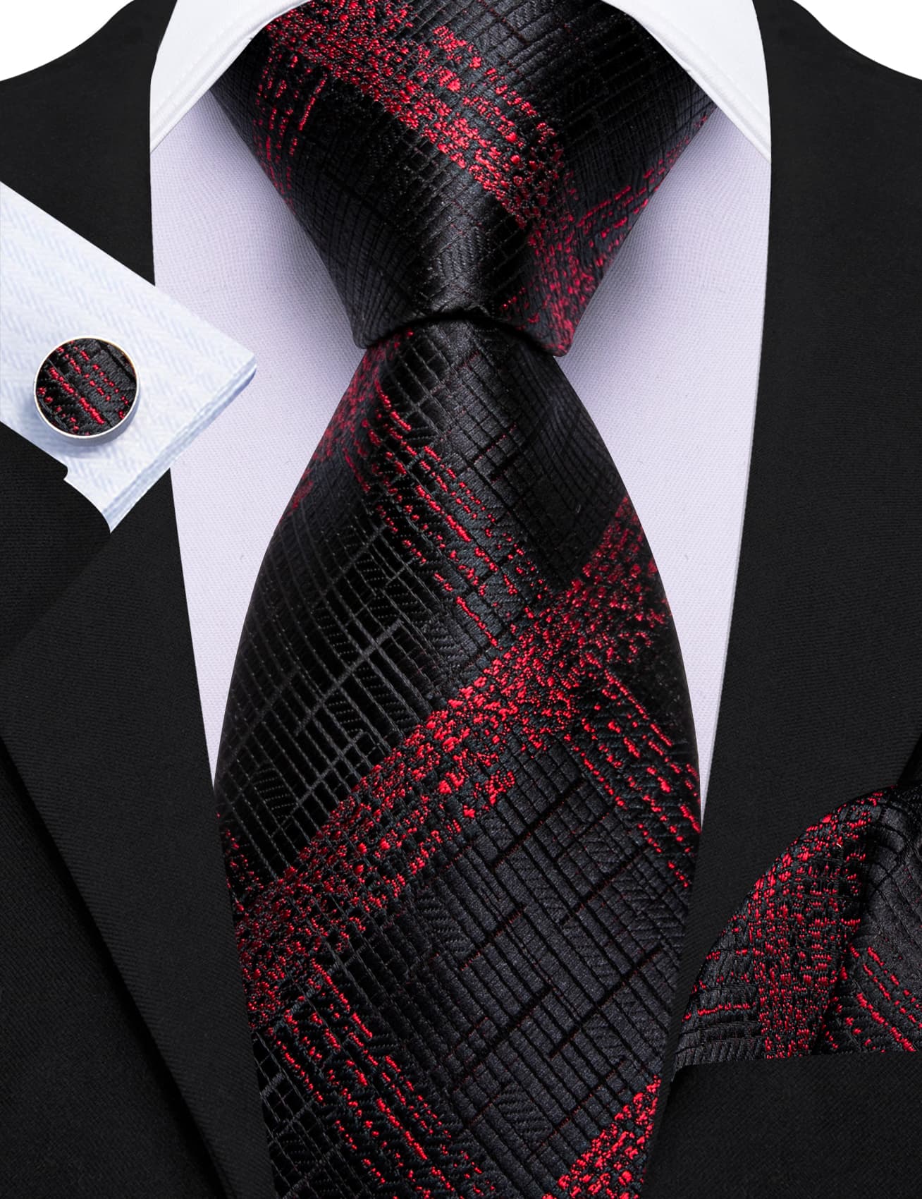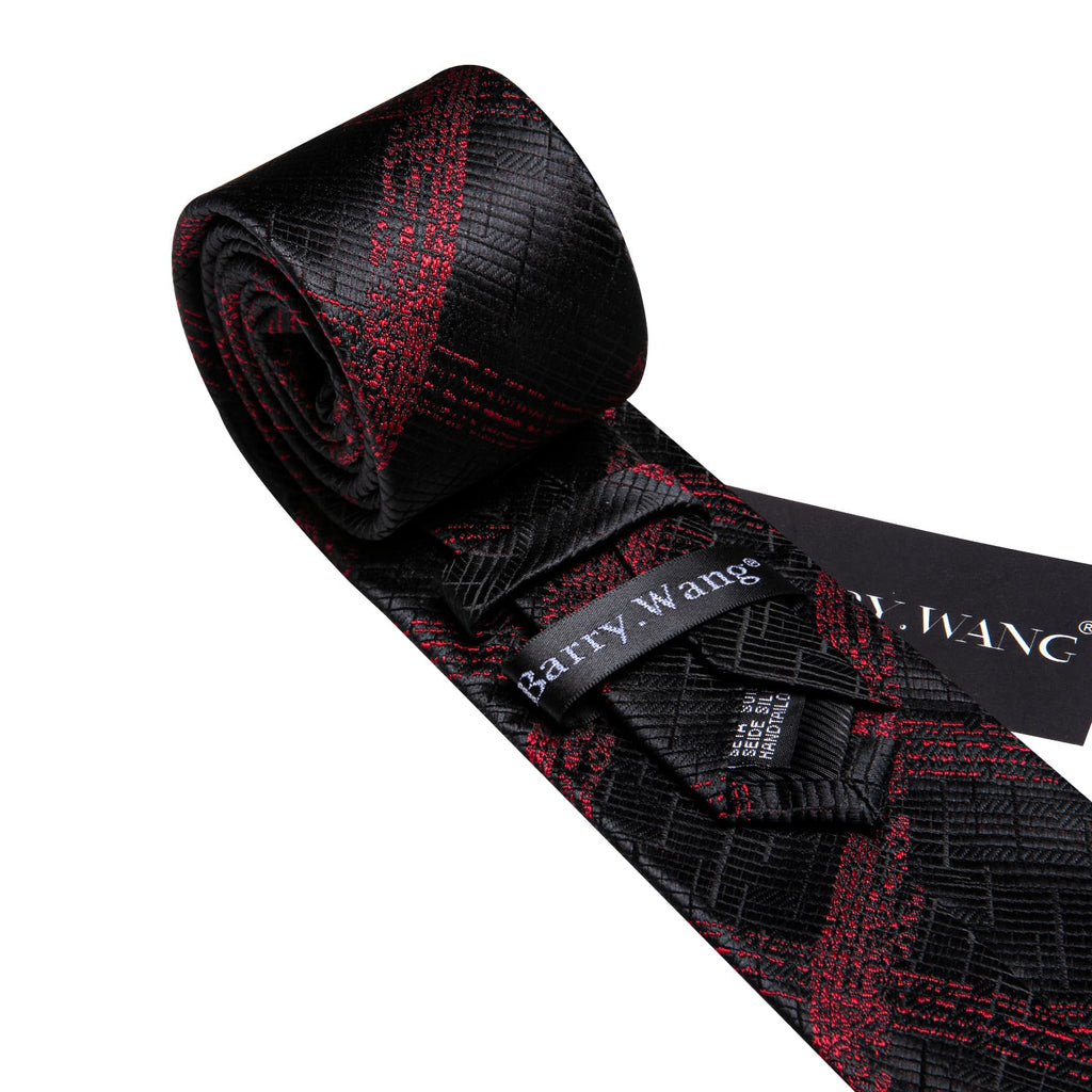 Barry. Wang Black Tie Dark Red Jacquard Stripes Plaid Tie Set for Men