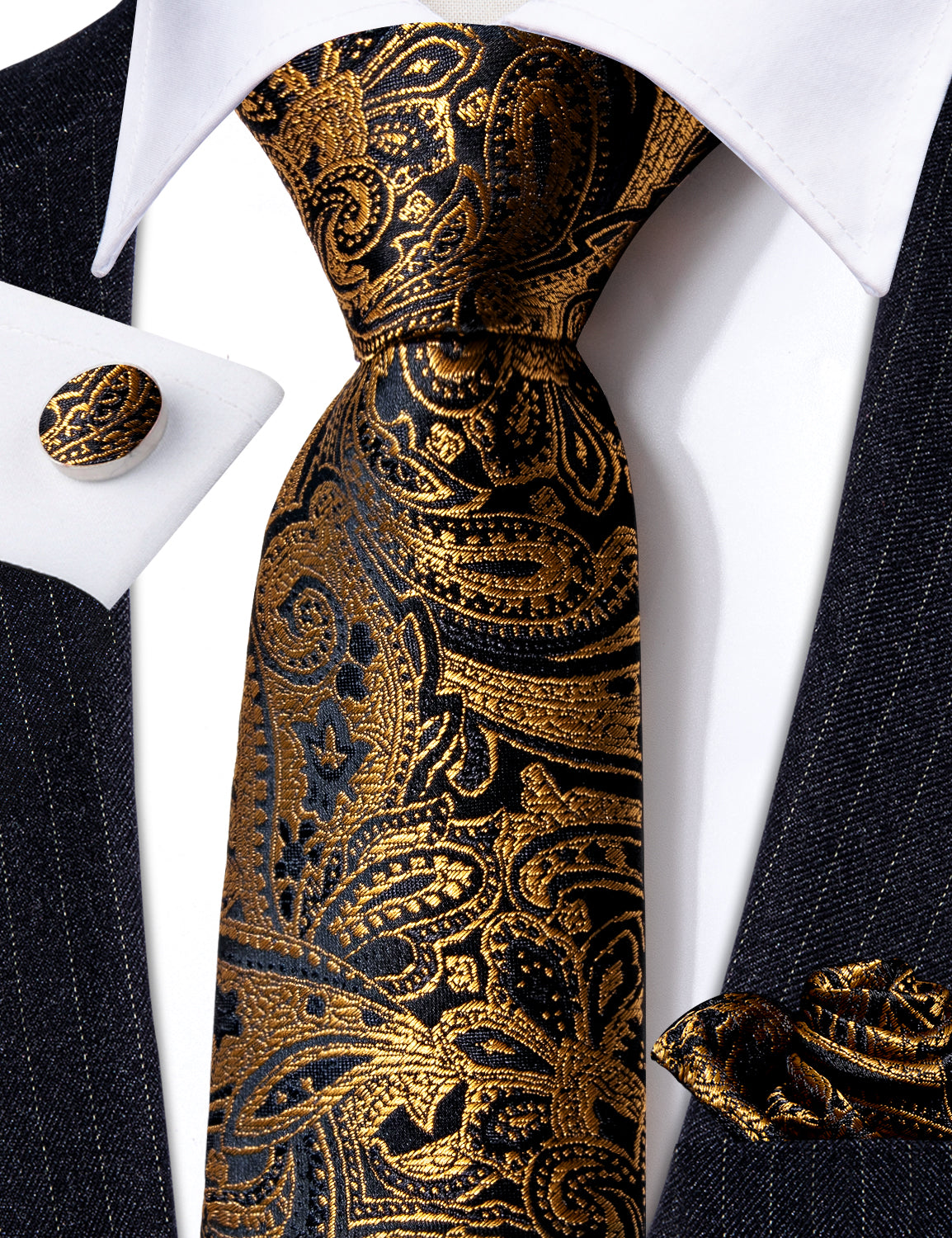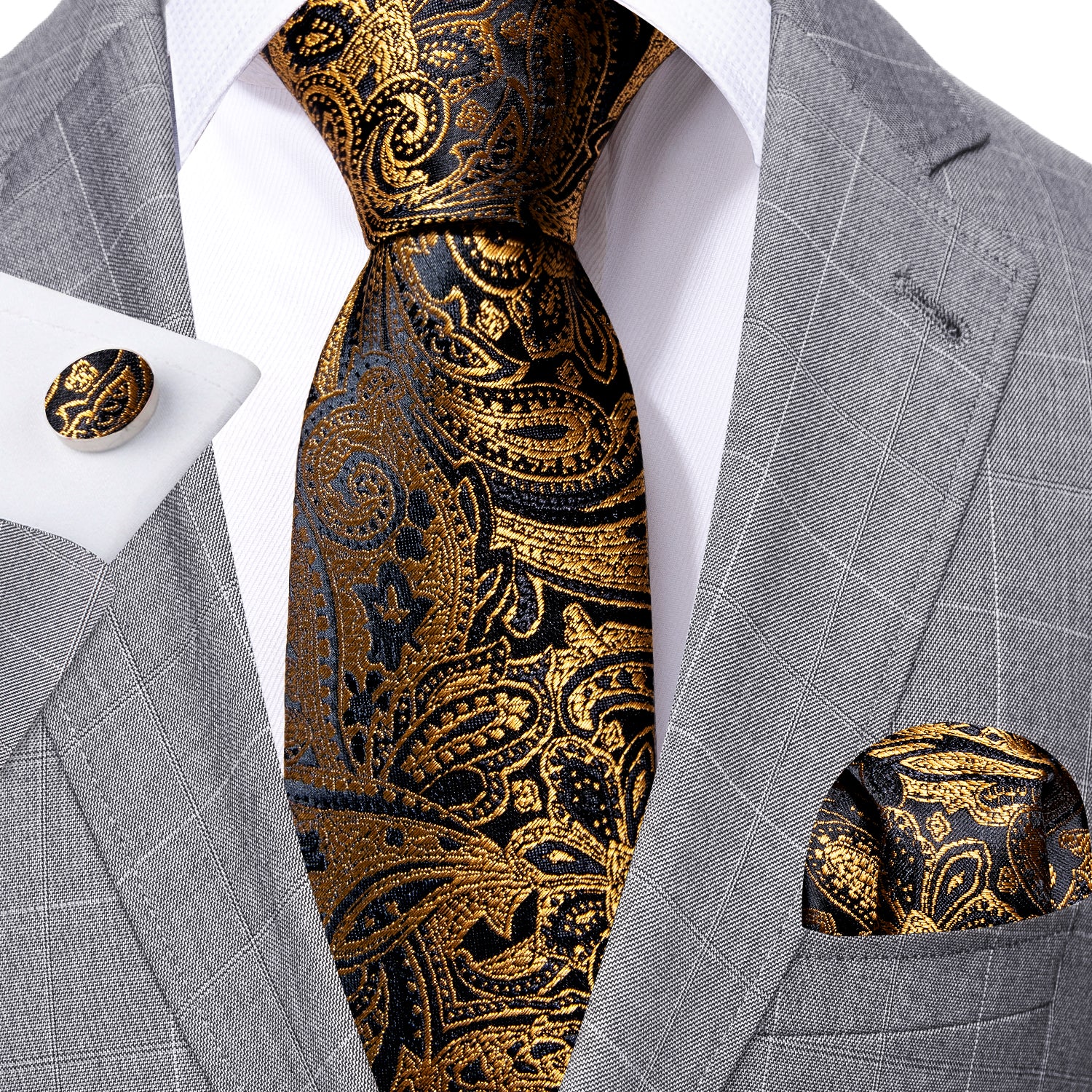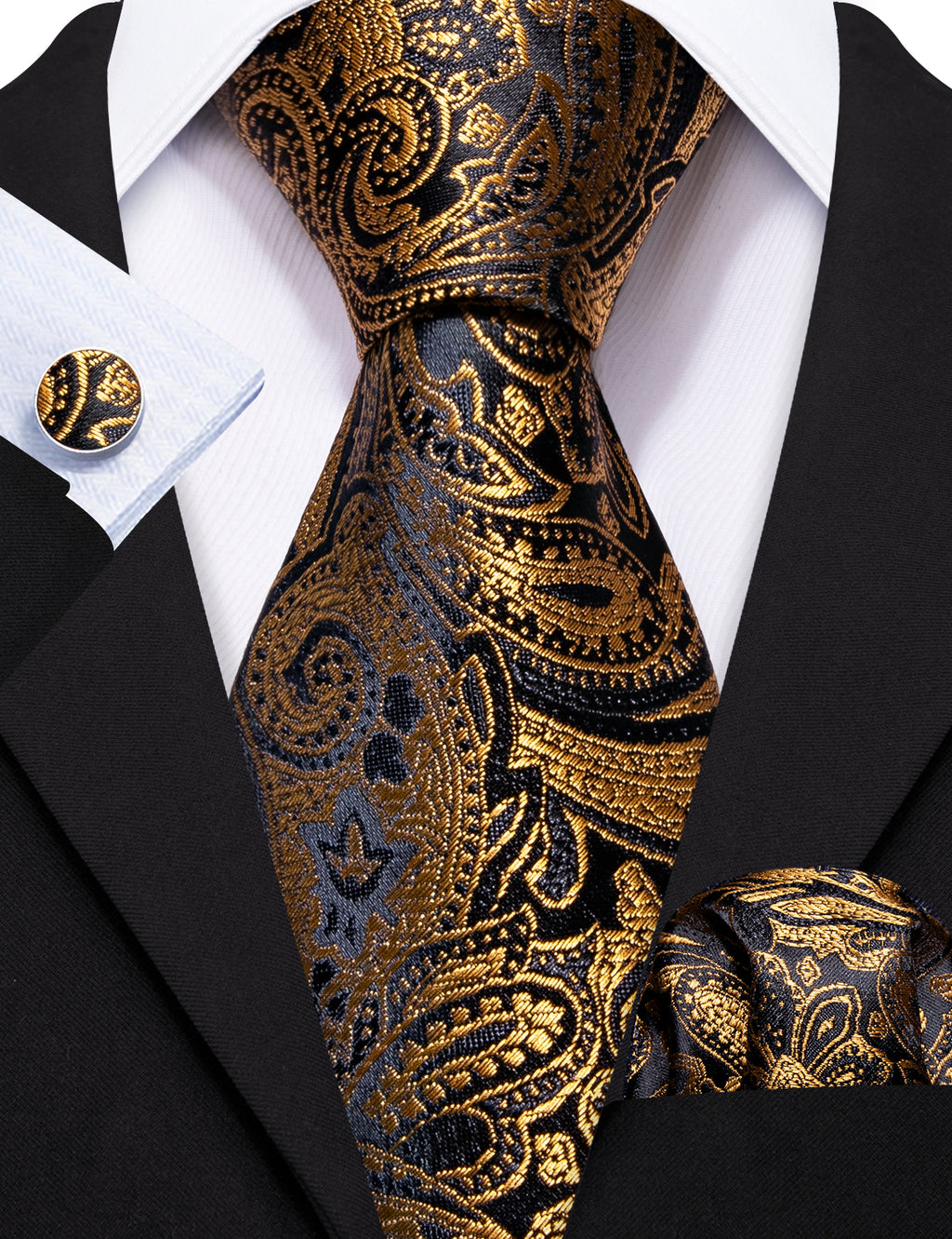 Barry. Wang Gold Paisley Formal Tie Silk Suit Necktie Pocket Square Set