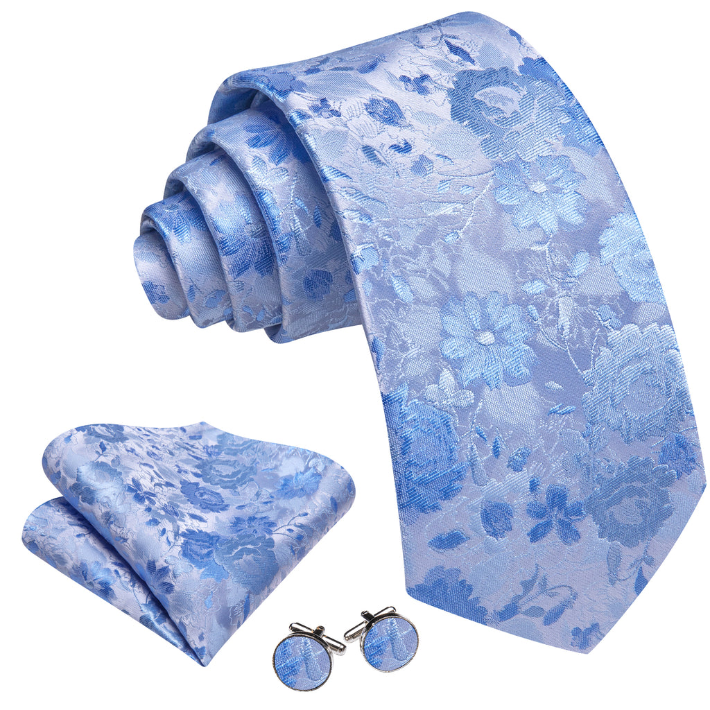 Barry. Wang Carolina Blue Floral Silk Men's Tie Handkerchief Cufflinks Set