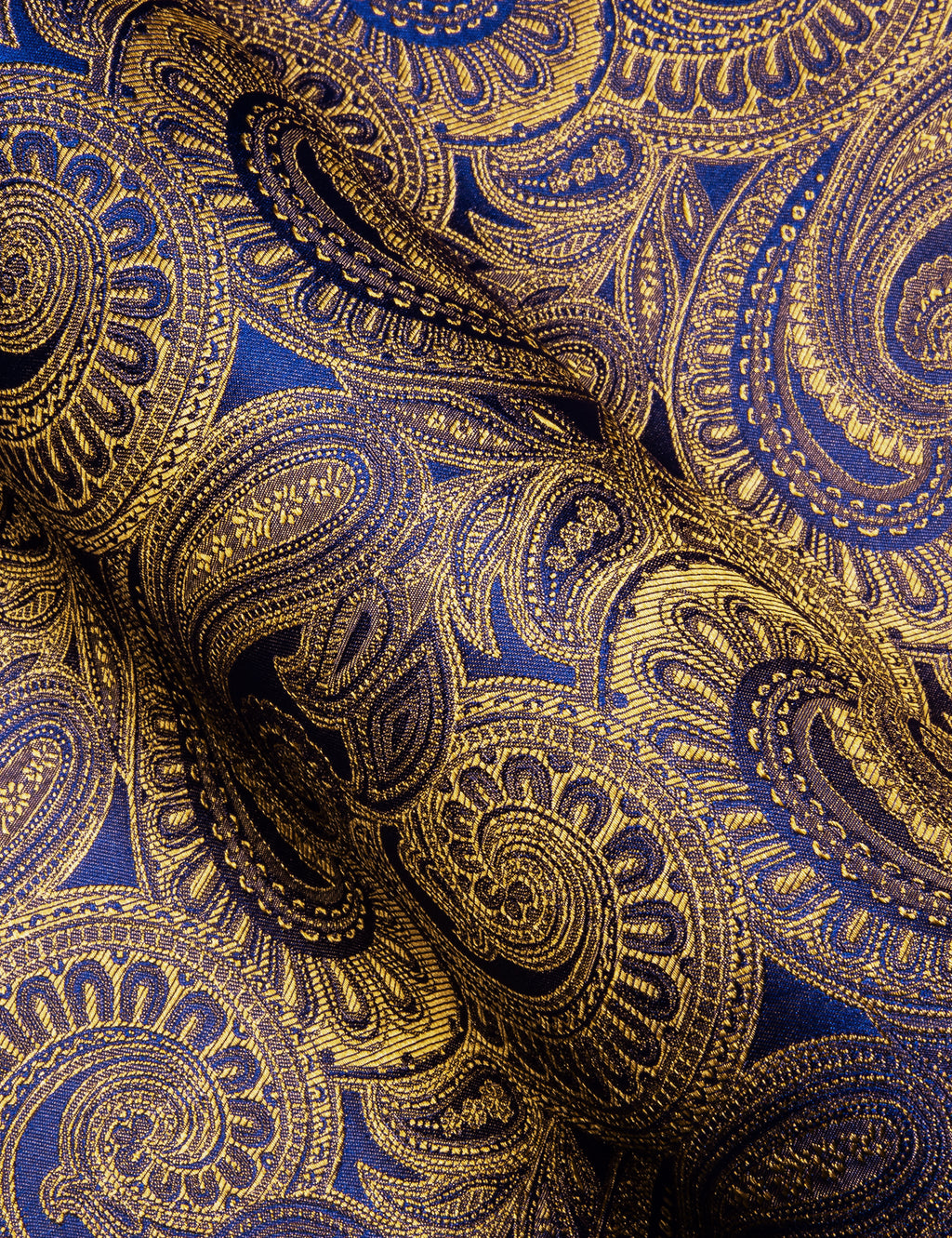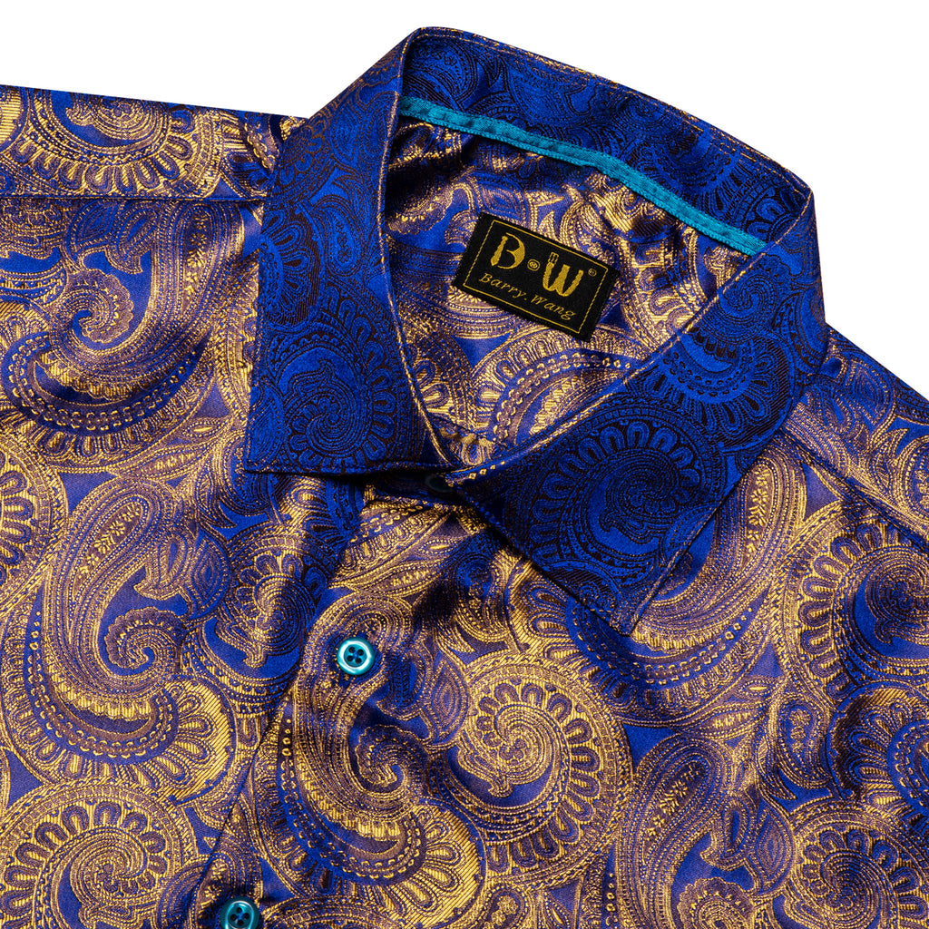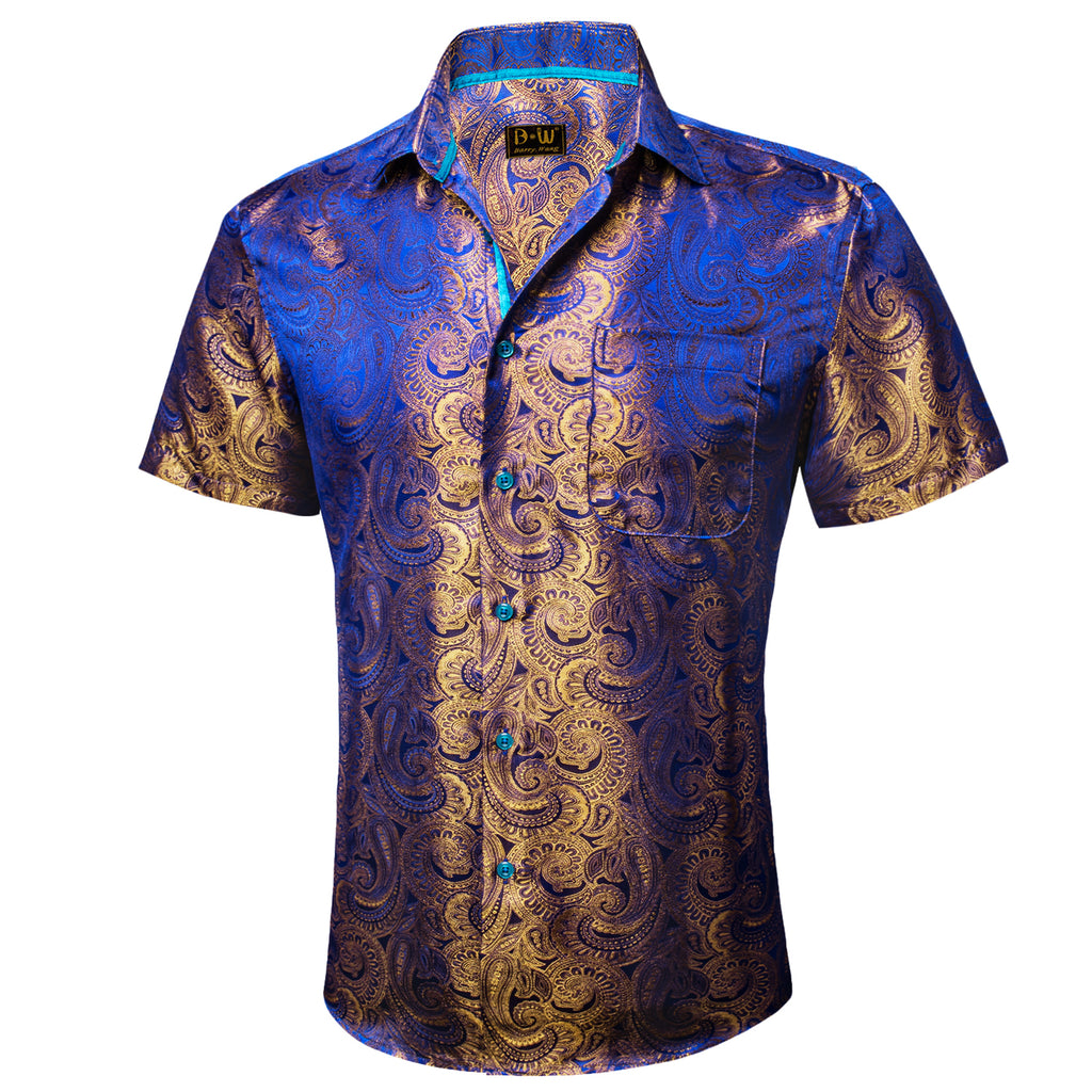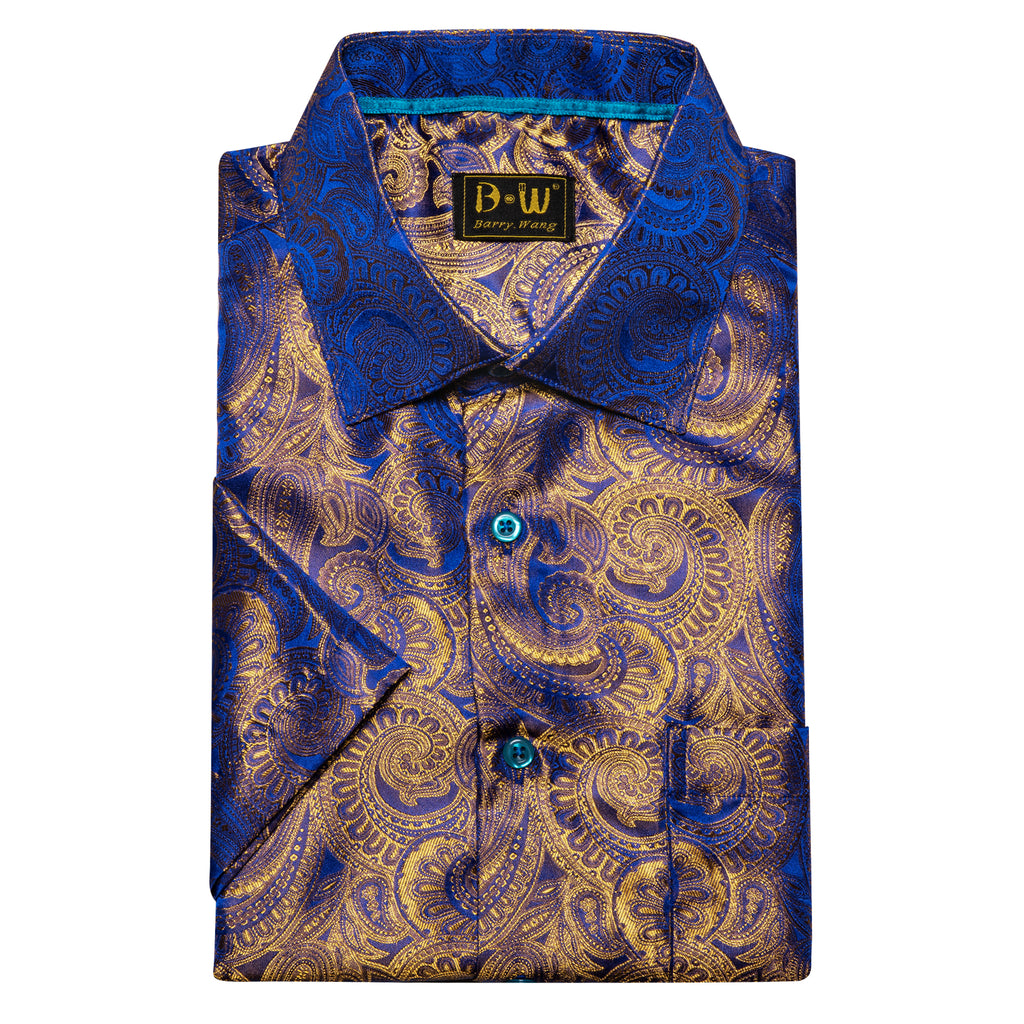 Barry. Wang Golden Blue Paisley Jacquard Short Sleeve Button Up Shirt for Men