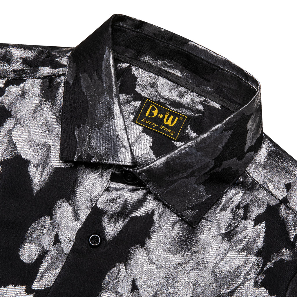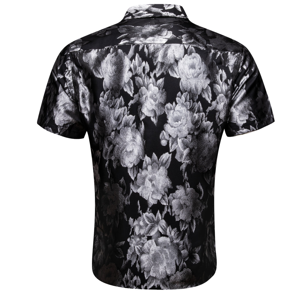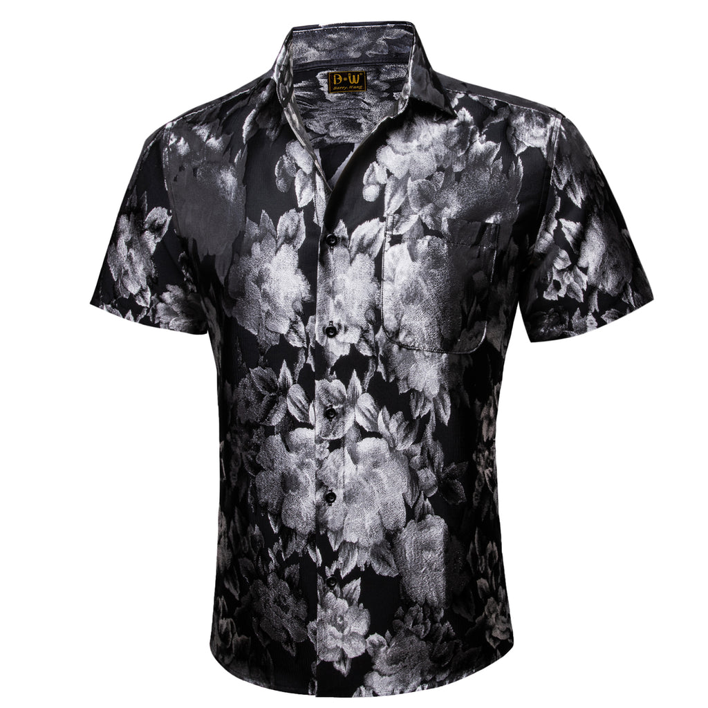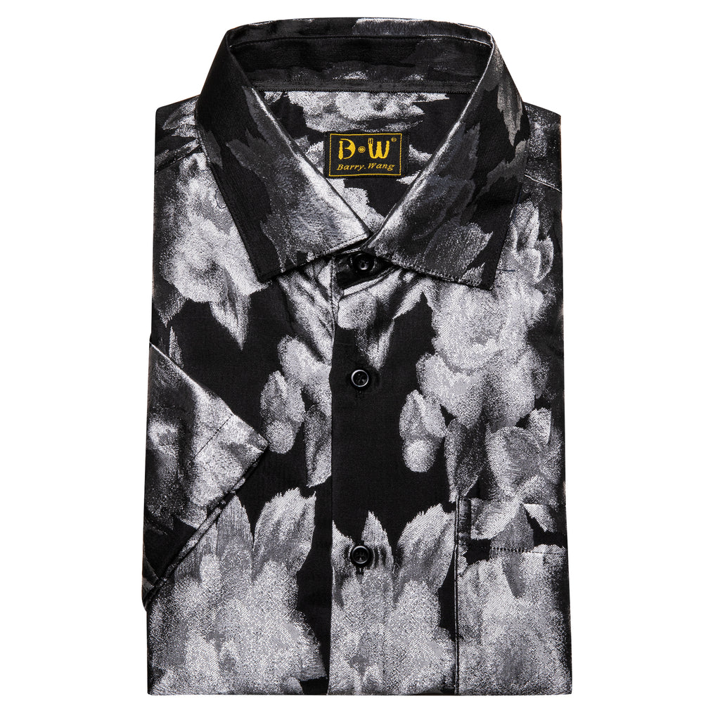 Barry. Wang Grey Black Floral Jacquard Short Sleeve Button Up Shirt for Men