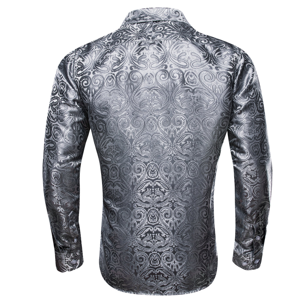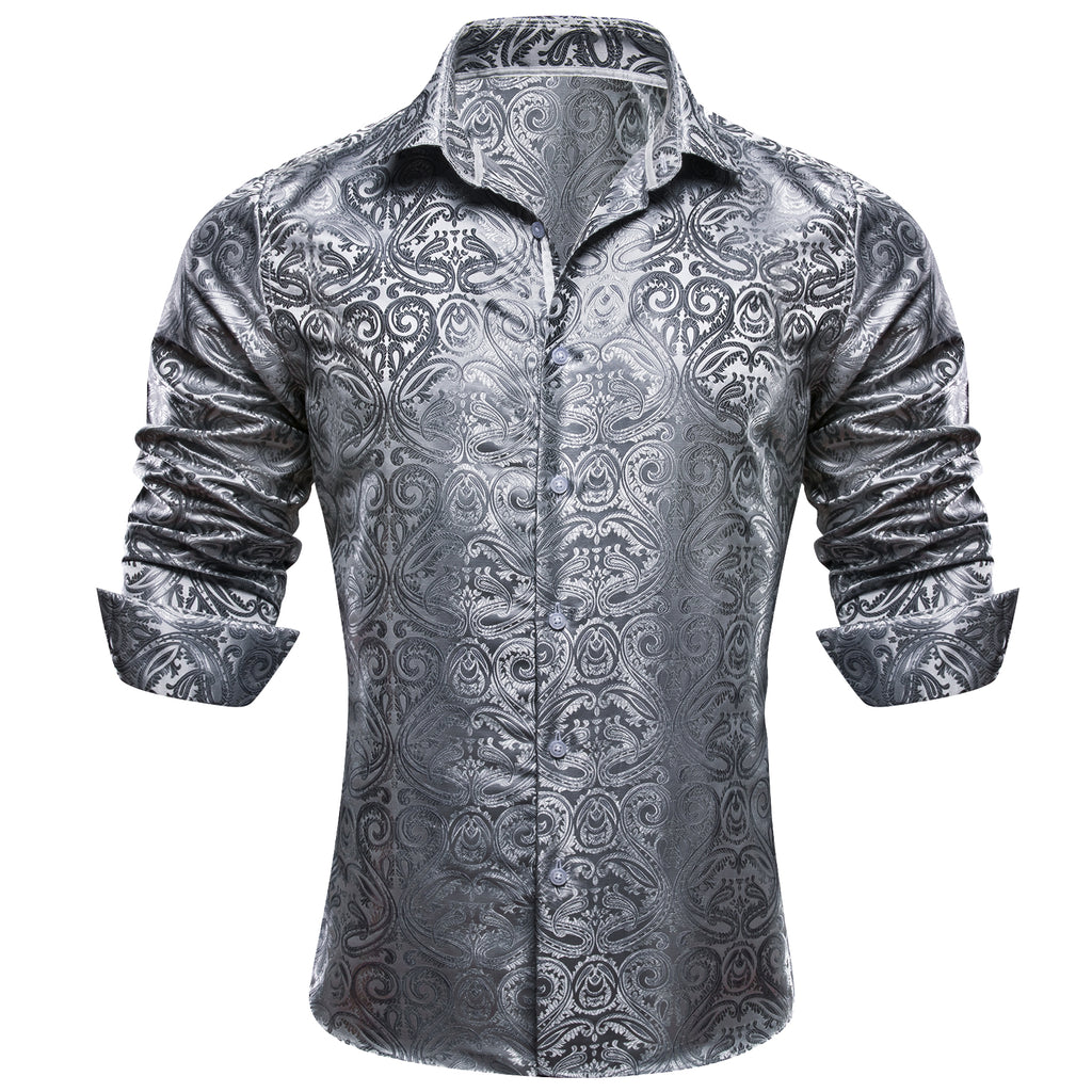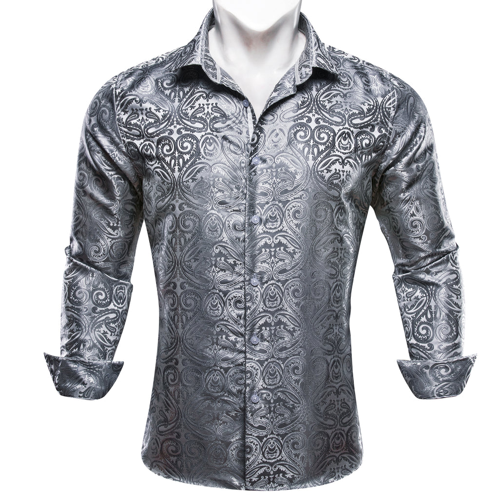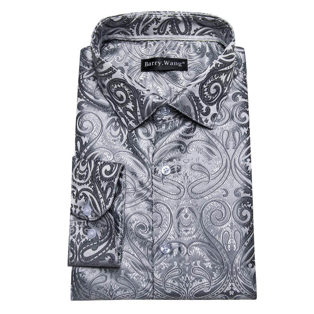 Barry. Wang Grey Shirt Silver Paisley Mens Silk Long Sleeve Dress Shirt