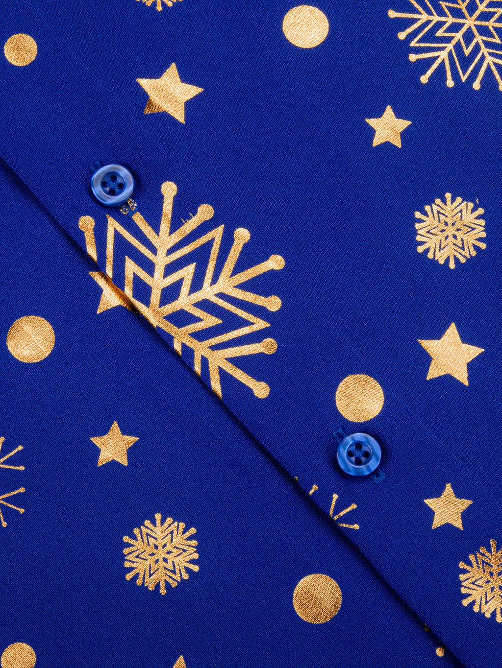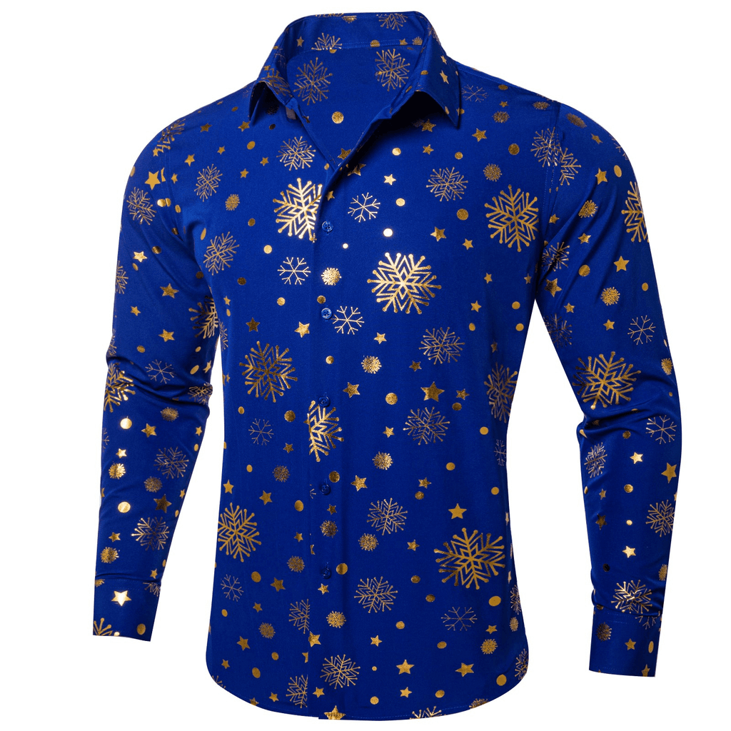 Barry. Wang Holiday Royal Blue Shirt Gold Snowflake Pattern Long Sleeve Shirt