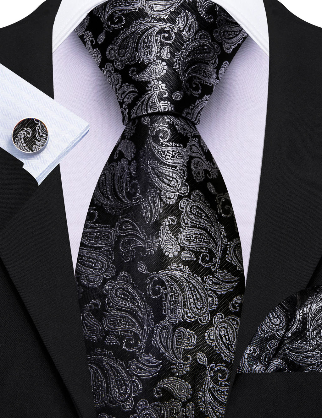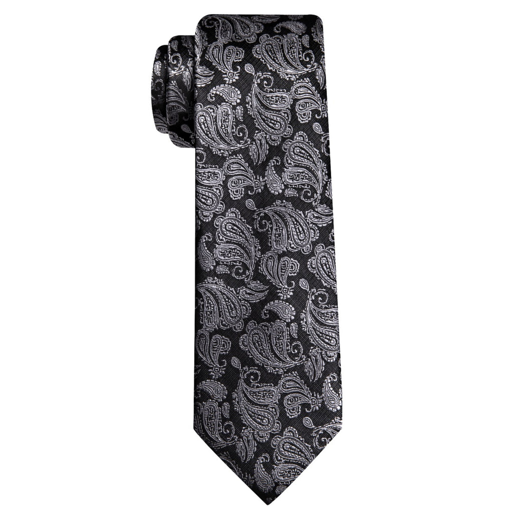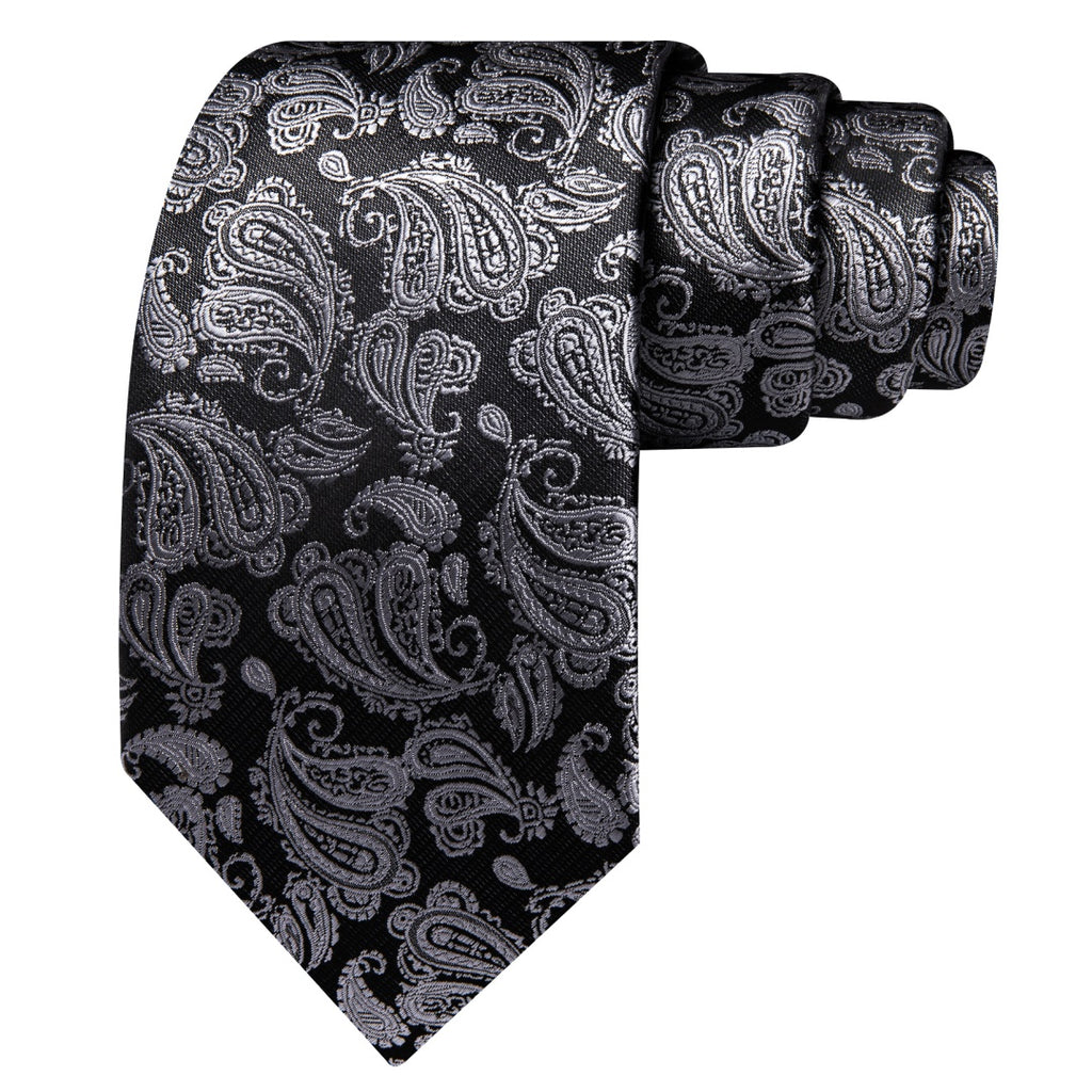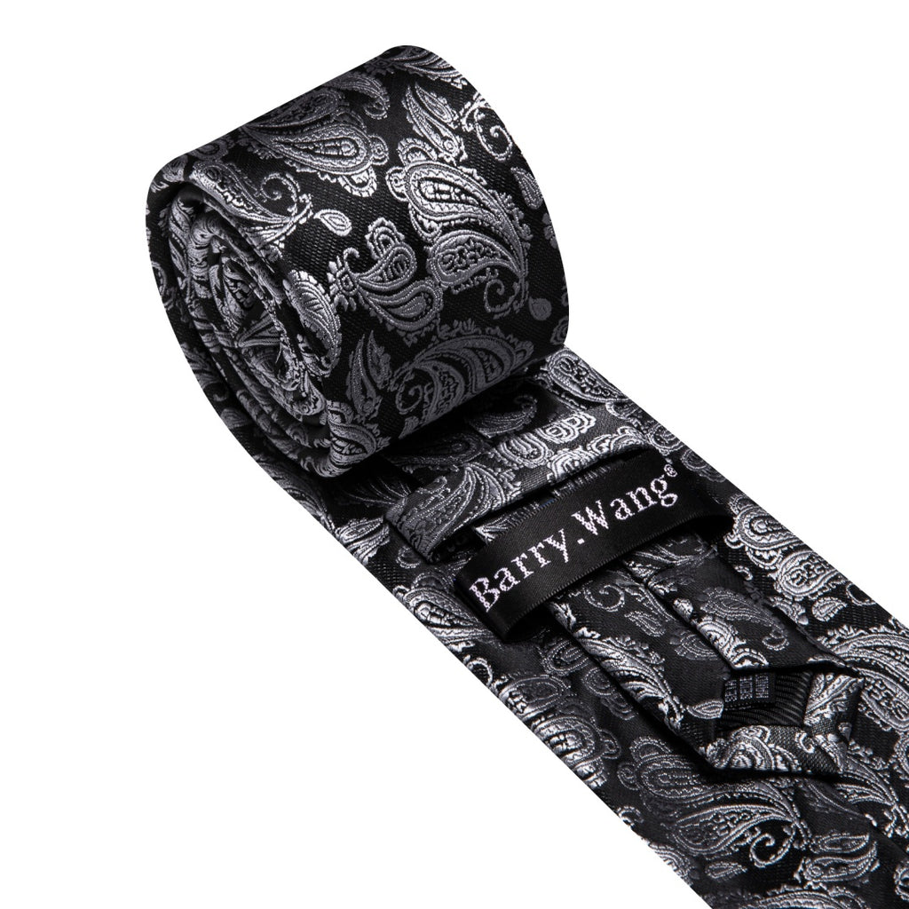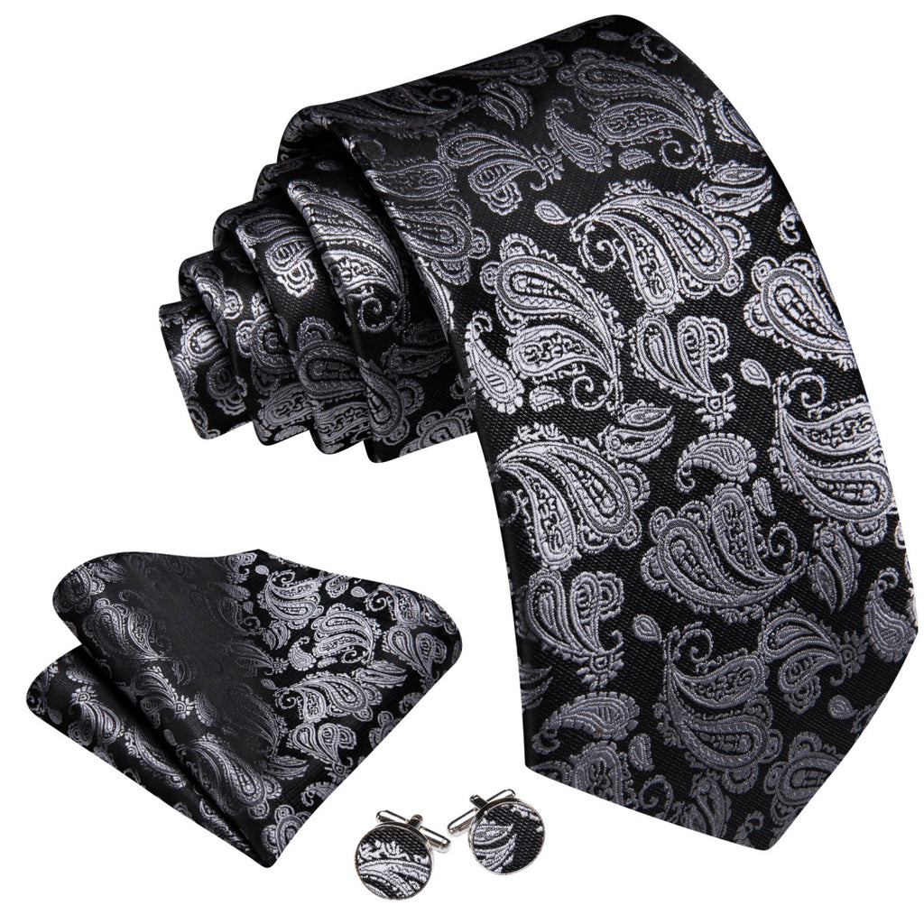 Barry. Wang Mens Black and Grey Paisley Tie Pocket Square Cufflinks Set