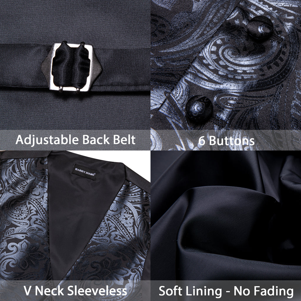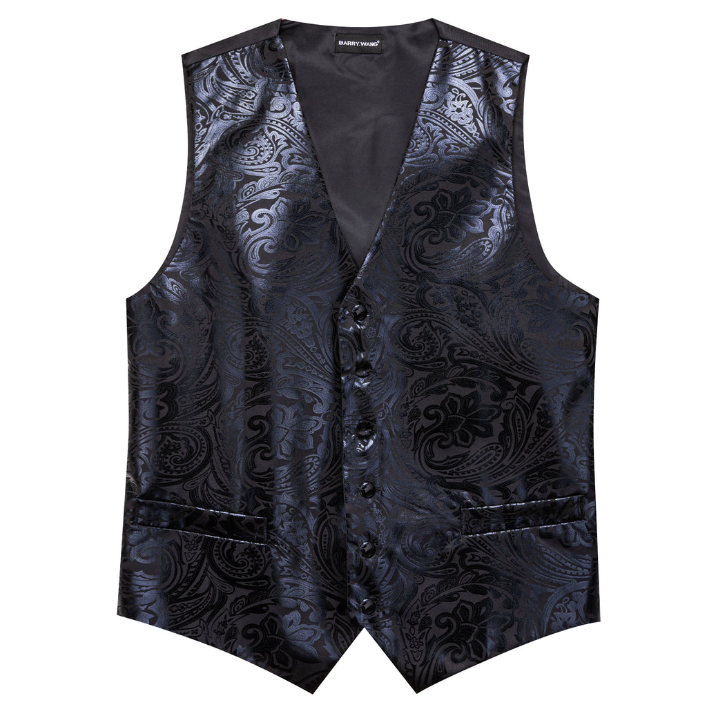 Barry. Wang Black Formal Vest Paisley V-neck Dress Vest Necktie Hanky Cufflinks Set