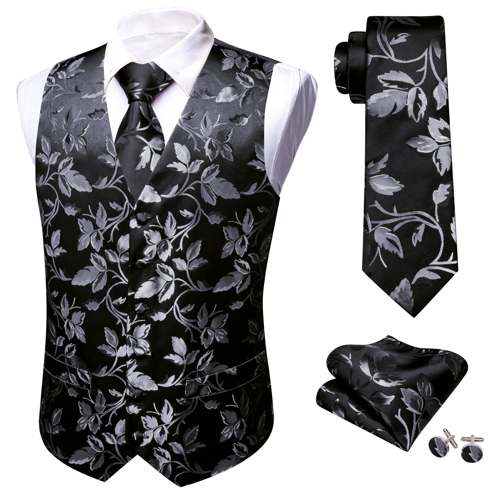 Barry. Wang Silver Floral Formal Vest Black Suit Vest Necktie Pocket Square Cufflinks Set