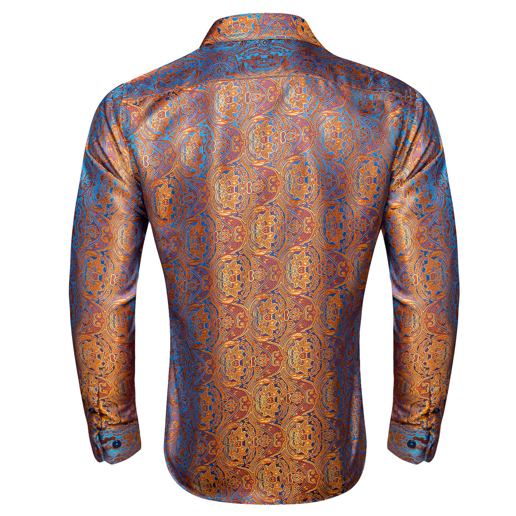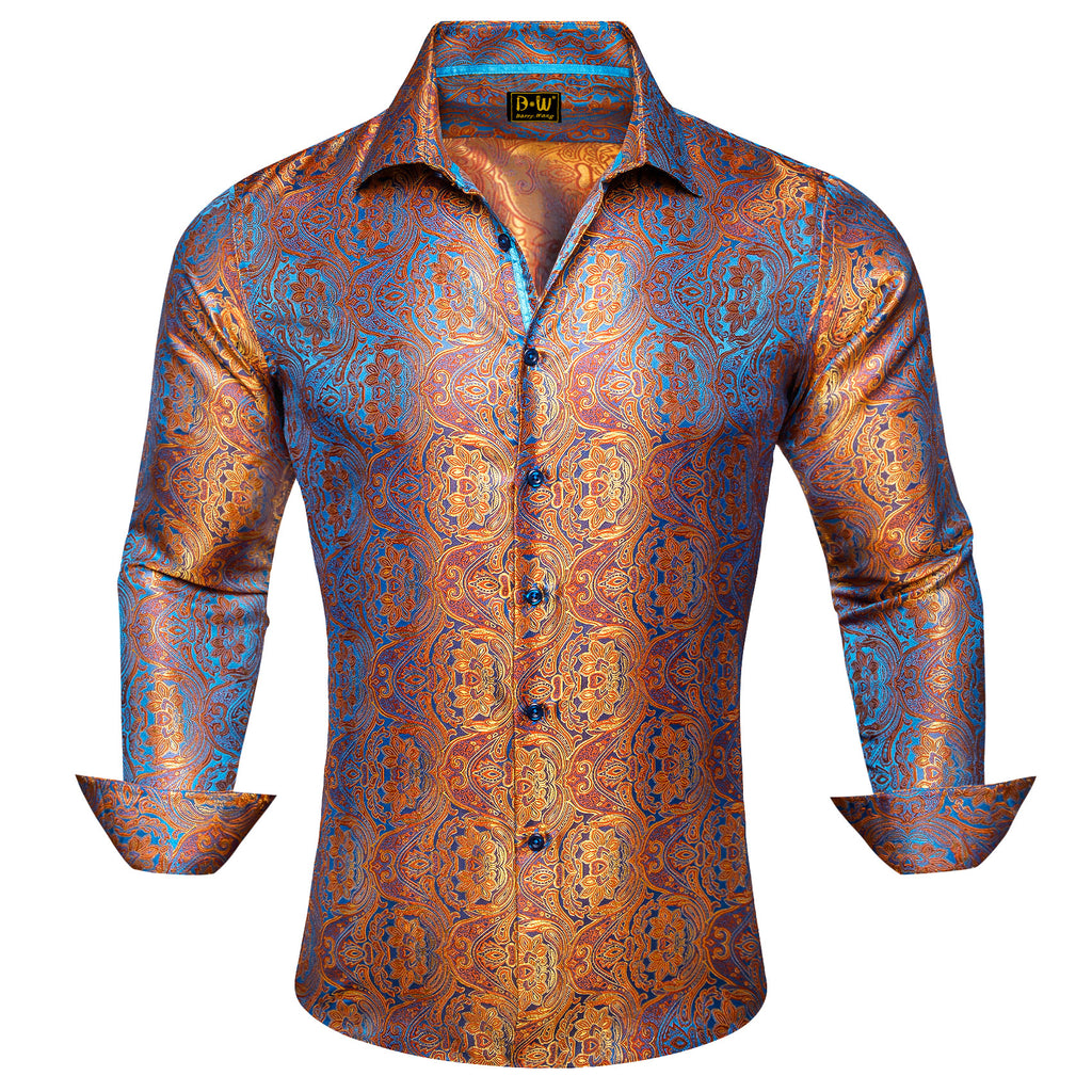 Barry. Wang Mens Button Down Shirt Orange Blue Floral Casual Silk Long Sleeve Dress Shirt