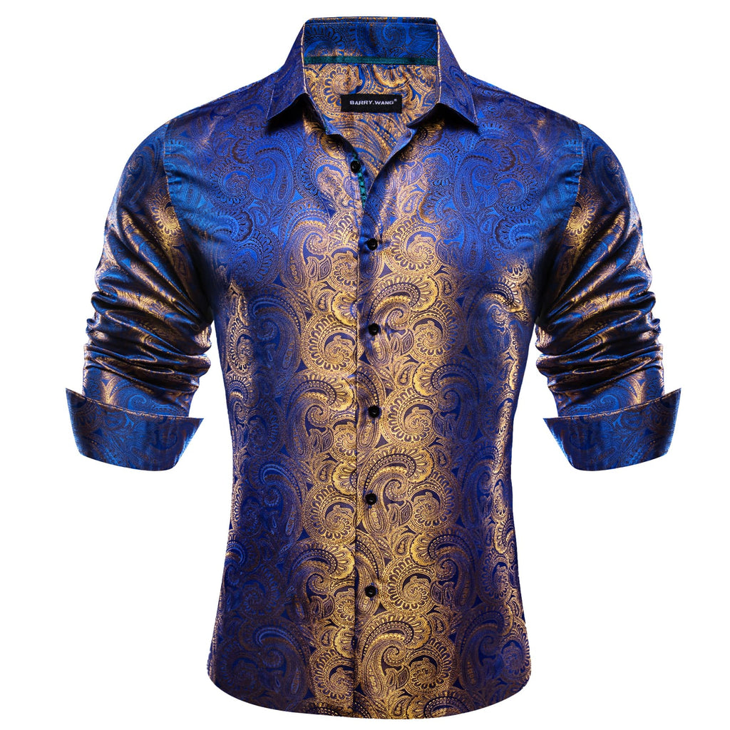 Barry. Wang Mens Paisley Dress Shirt Gold Blue 70s Disco Long Sleeve Button Down Shirt