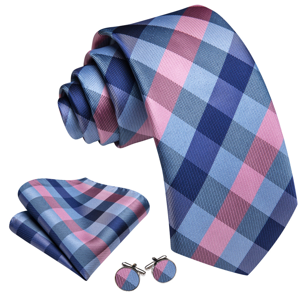 Barry. Wang Men's Necktie Blue Pink Plaid Tie Handkerchief Cufflinks Set