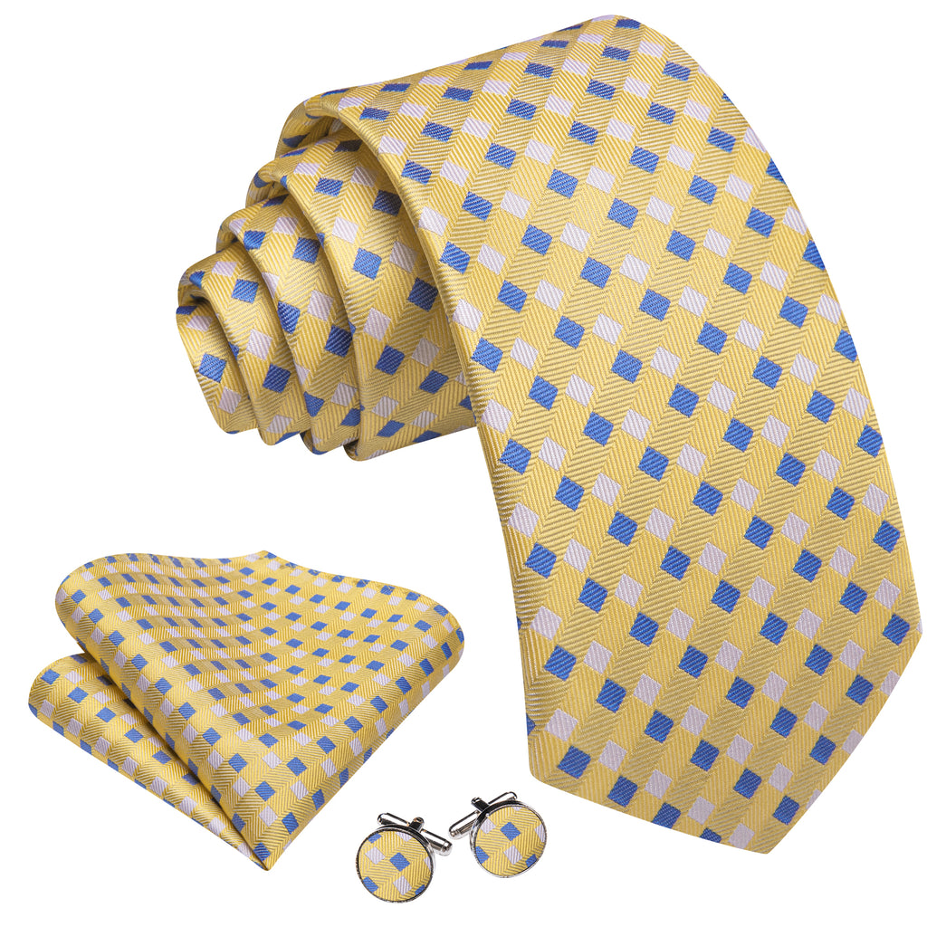 Barry. Wang Yellow Necktie Blue Plaid Tie Handkerchief Cufflinks Set for Men