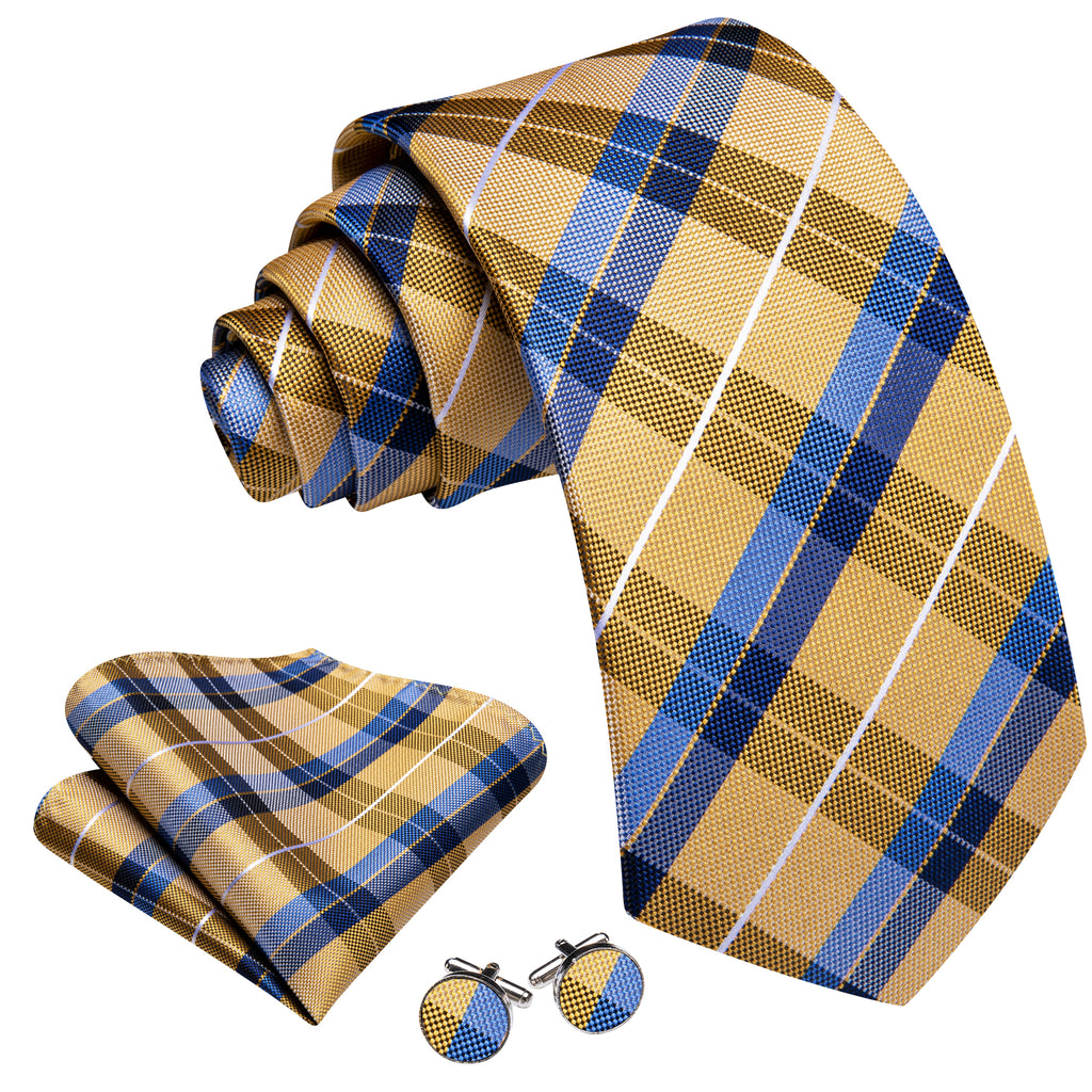 Barry. Wang Men's Necktie Gold Blue Plaid Tie Handkerchief Cufflinks Set
