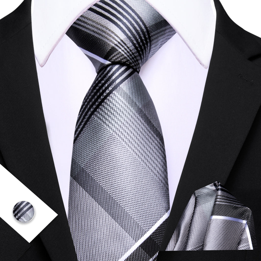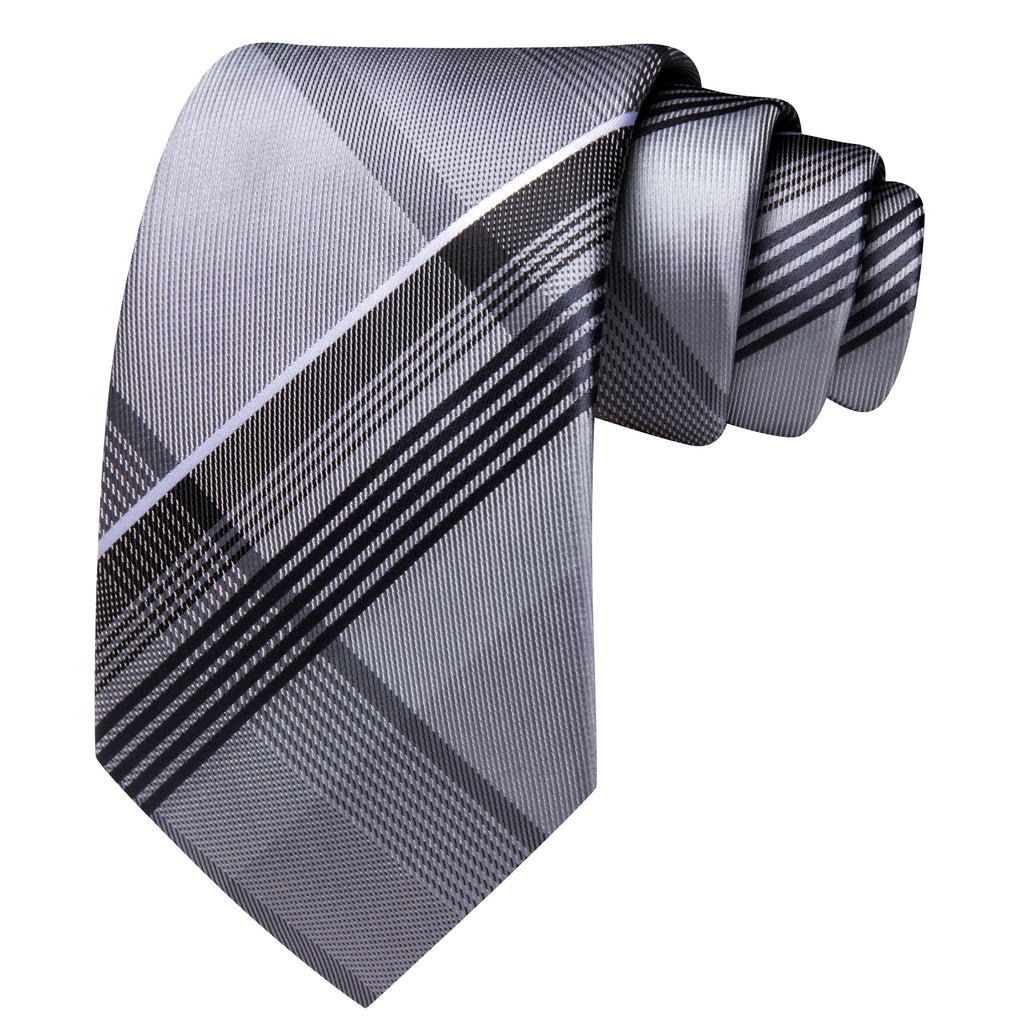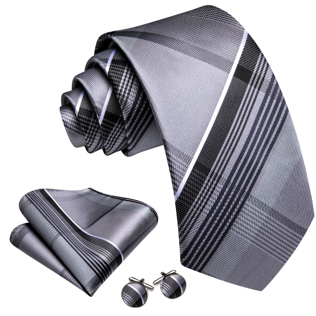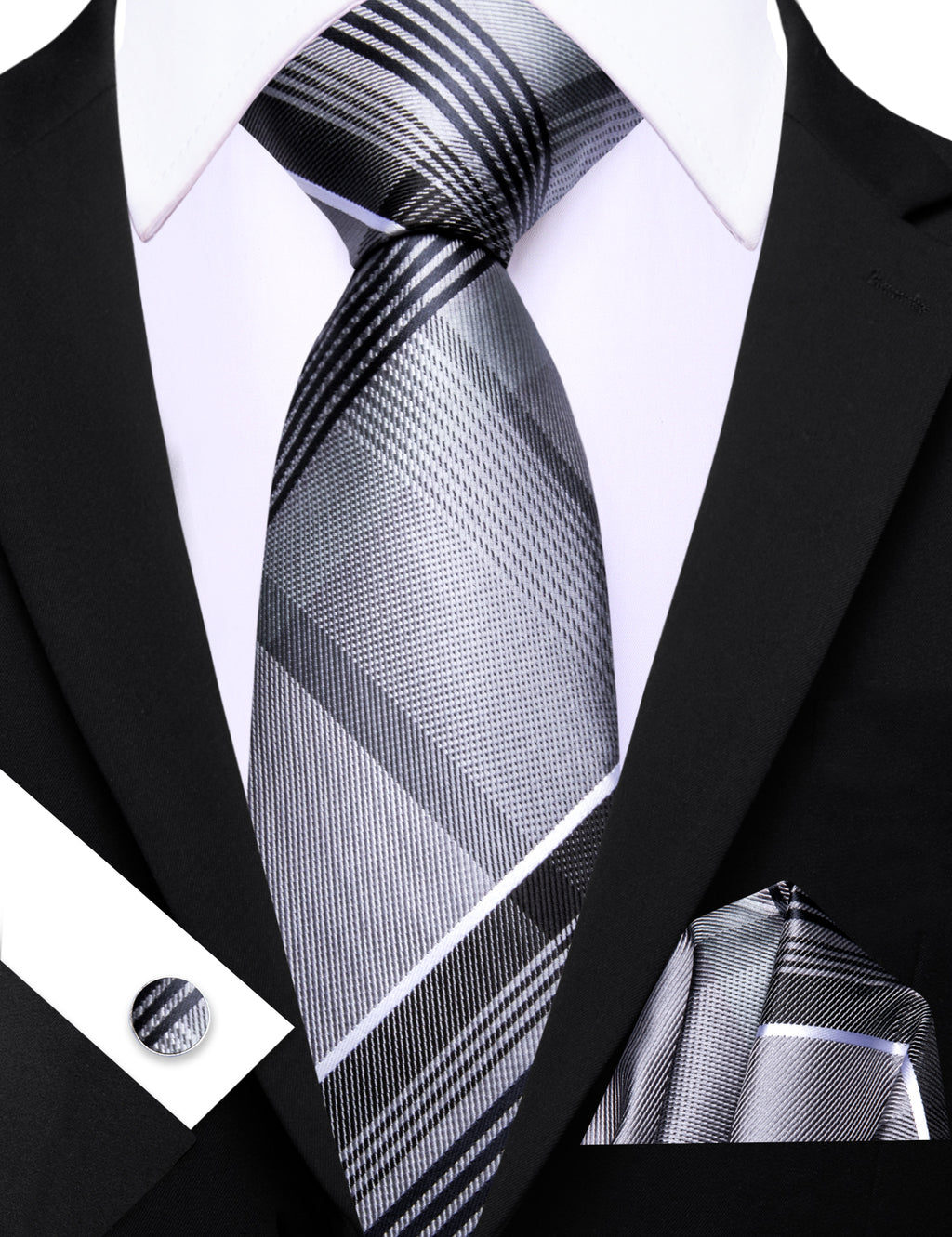 Barry. Wang Men's Necktie Silver Plaid Tie Handkerchief Cufflinks Set