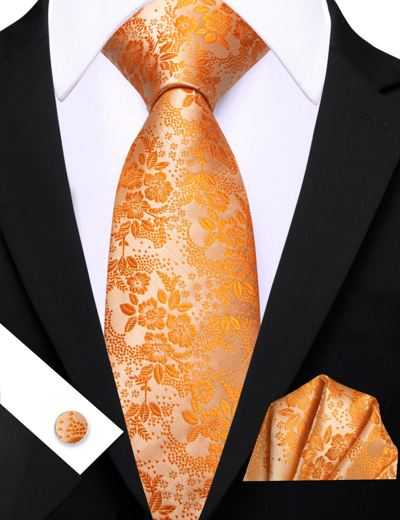 Barry. Wang Mens Orange Tie Floral Designer Tie Pocket Square Cufflinks Set