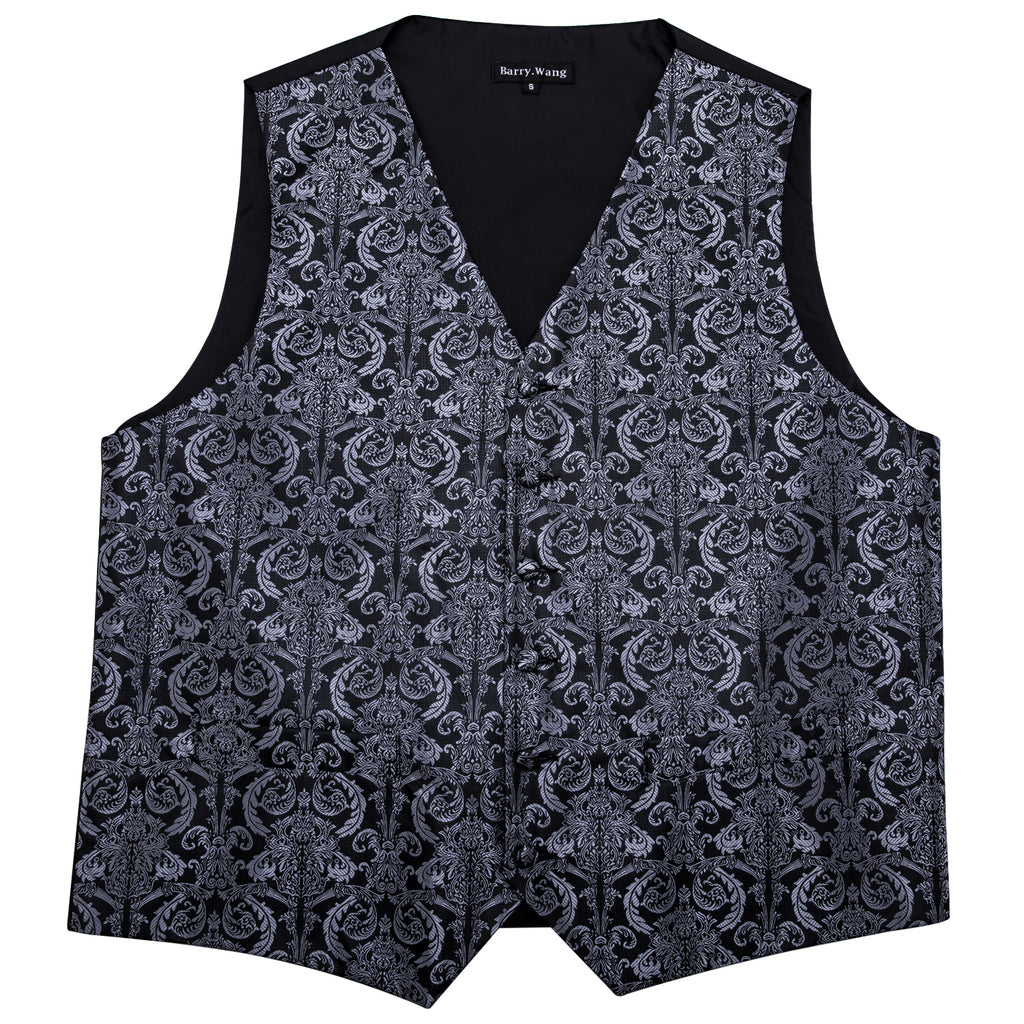 Barry. Wang Men's Vest Black Grey Floral Silk Vest Necktie Pocket Square Cufflinks