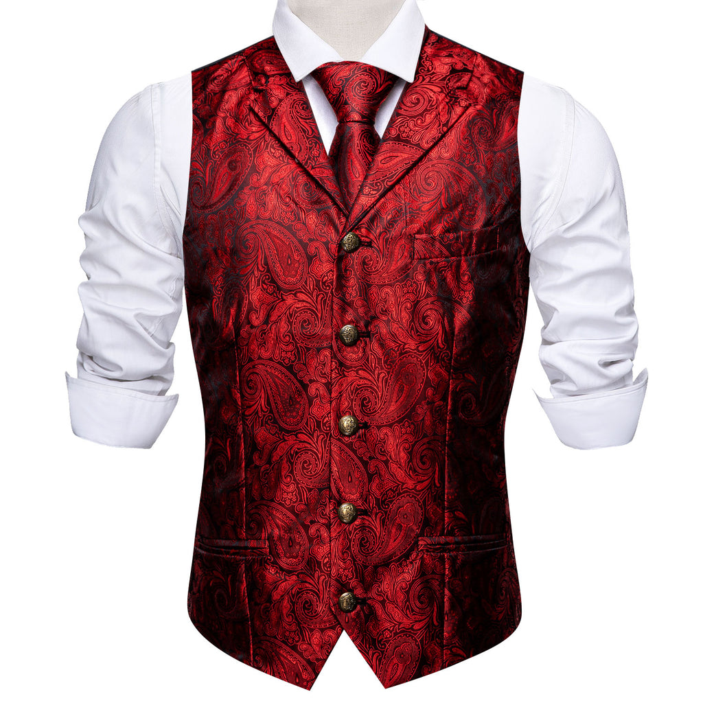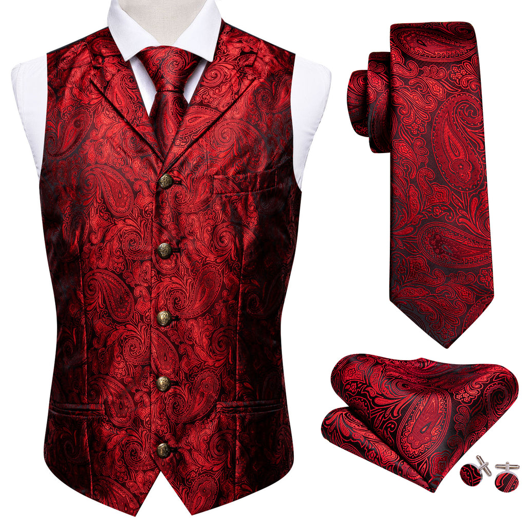 Barry. Wang Mens Red Collar Vest Paisley Suit Waistcoat Necktie Hanky Cufflinks Set