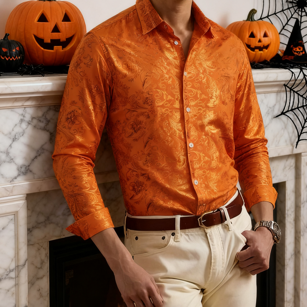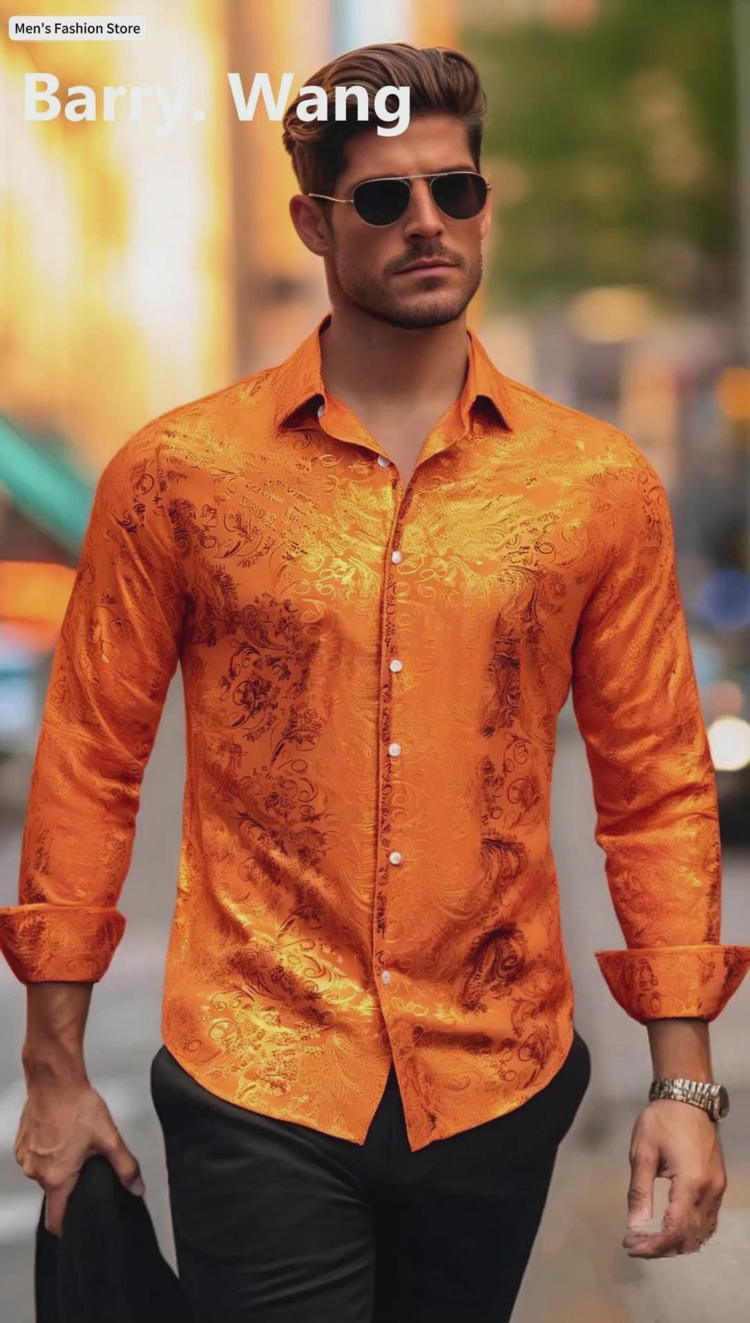 Barry. Wang Mens Western Dress Shirt Orange Paisley Button Down Silk Long Sleeve Shirt