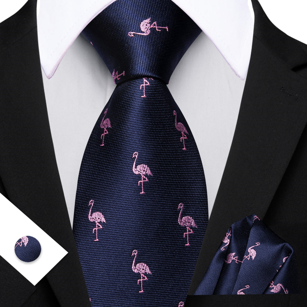 Barry. Wang Navy Blue Tie Pink Flamingo Pattern Novelty Necktie Set