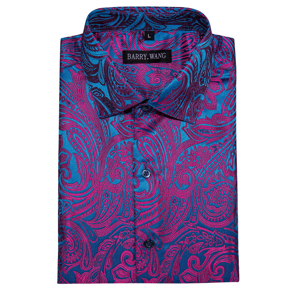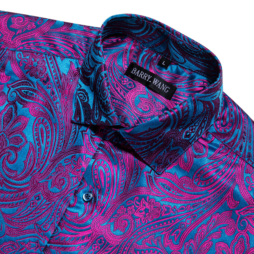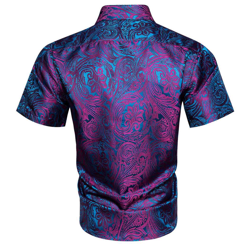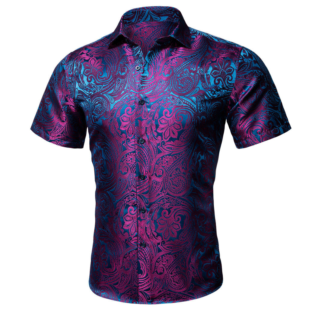 Barry. Wang Purple Blue Paisley Silk Short Sleeve Daily Slim Fit Men's Shirt