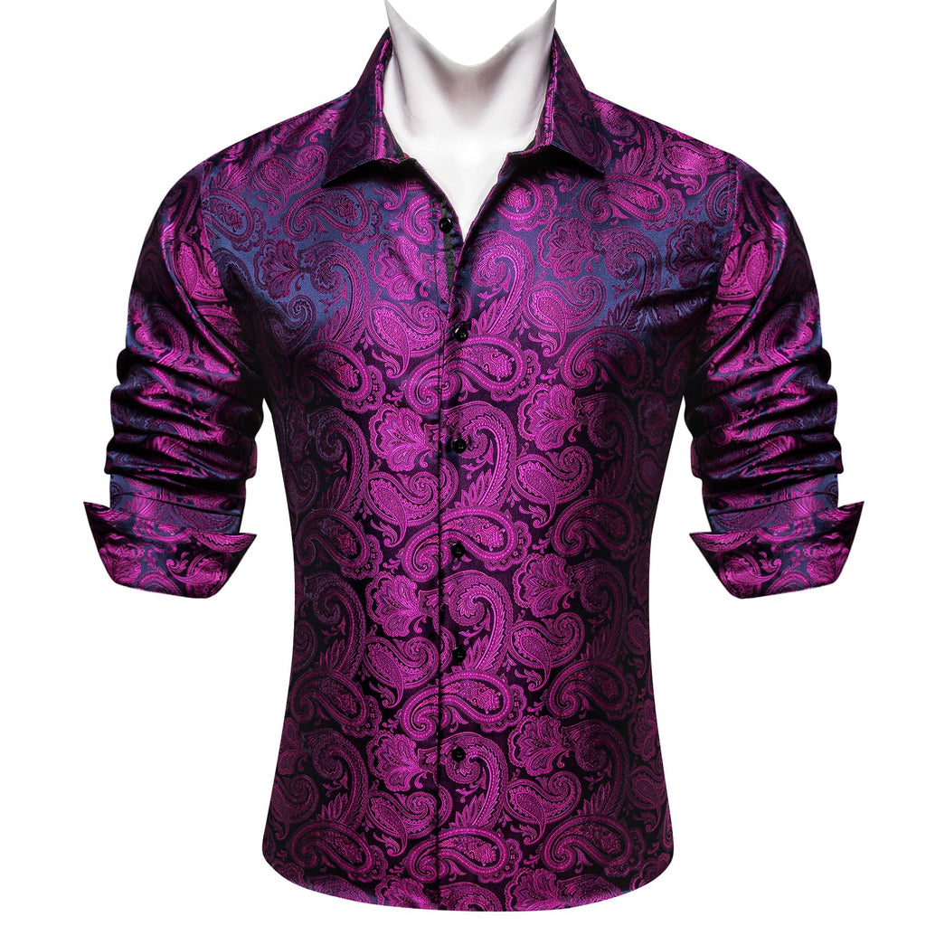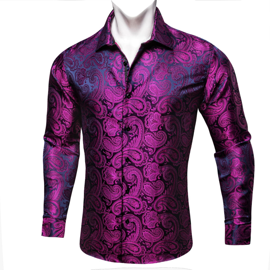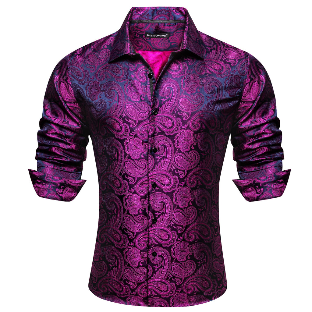Barry. Wang Silk Pueple Paisley Shirt Men Long Sleeve Dress Shirt
