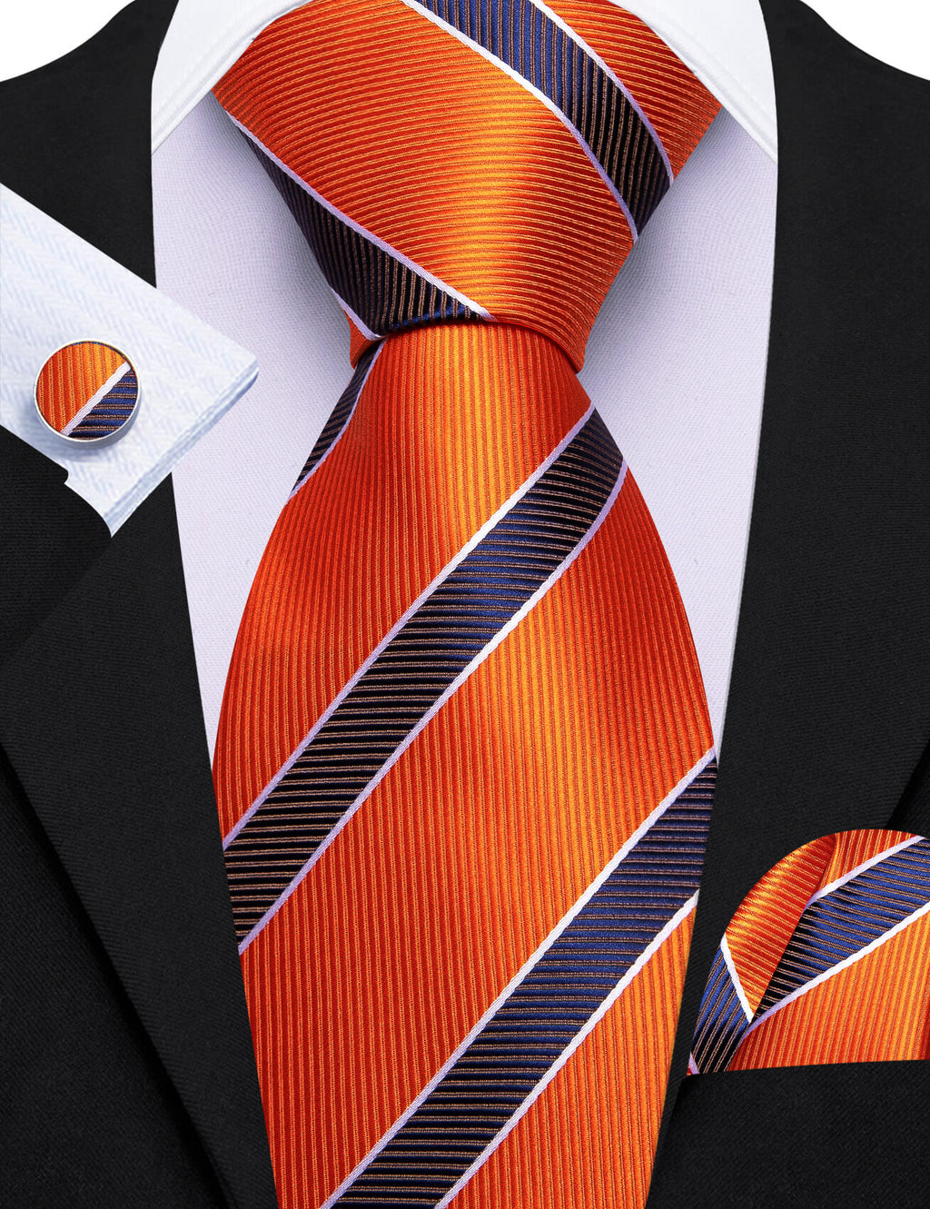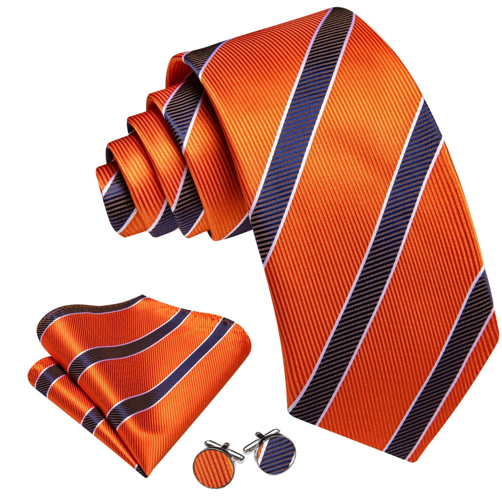 Barry. Wang Orange Tie Blue Striped Silk Tie Pocket Square Cufflinks Set for Men