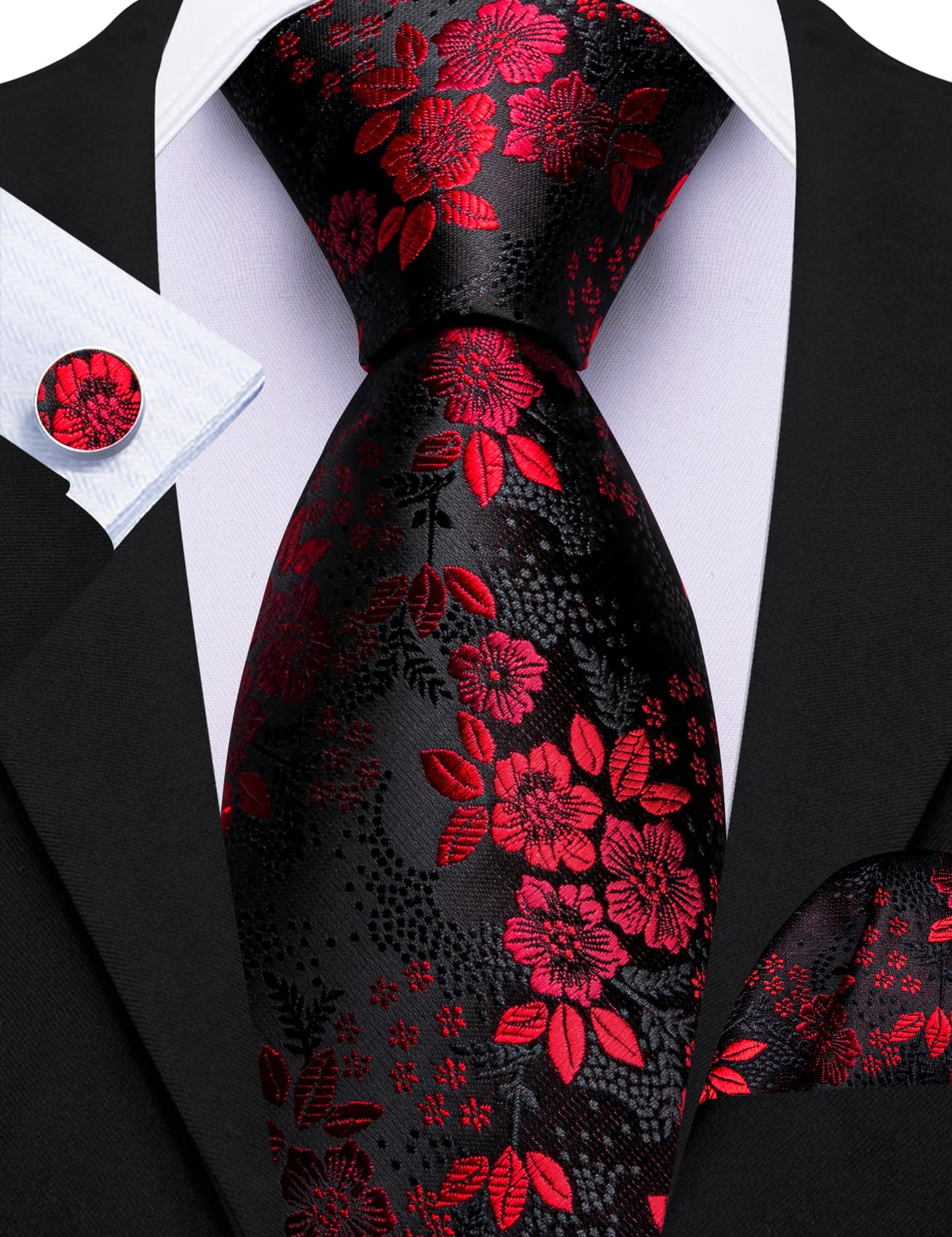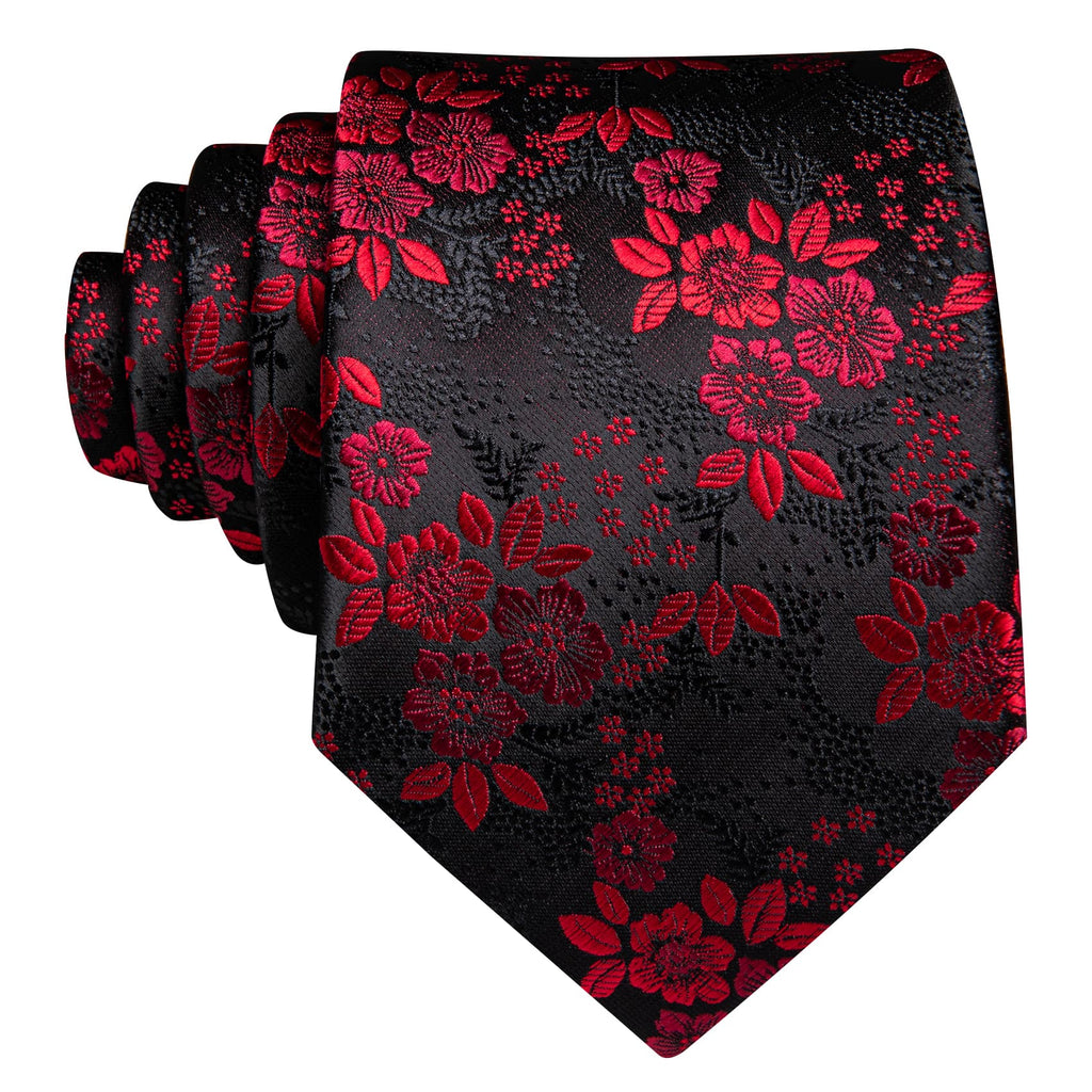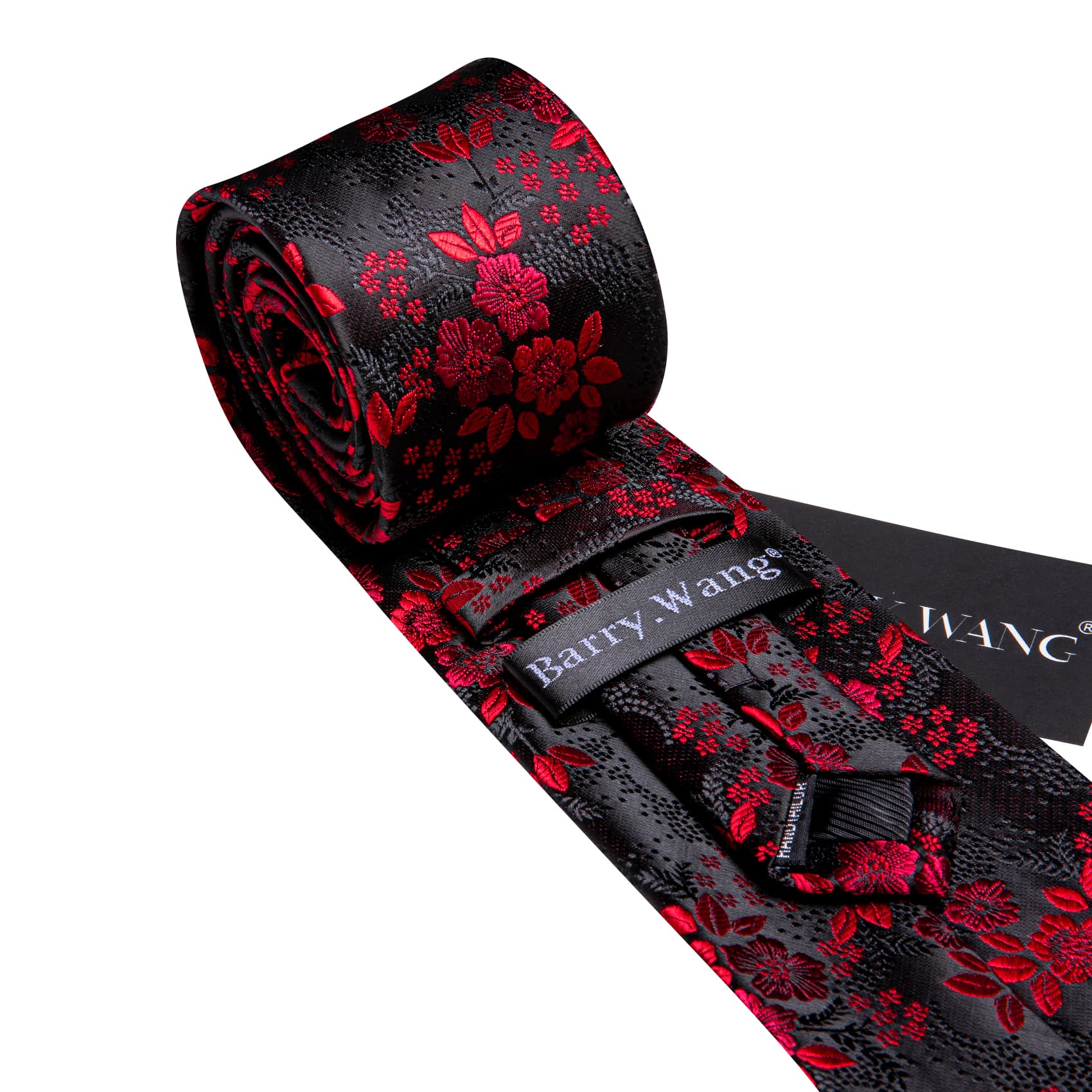 Barry. Wang Red Jacquard Floral Tie Black Silk Tie Hanky Cufflinks Set