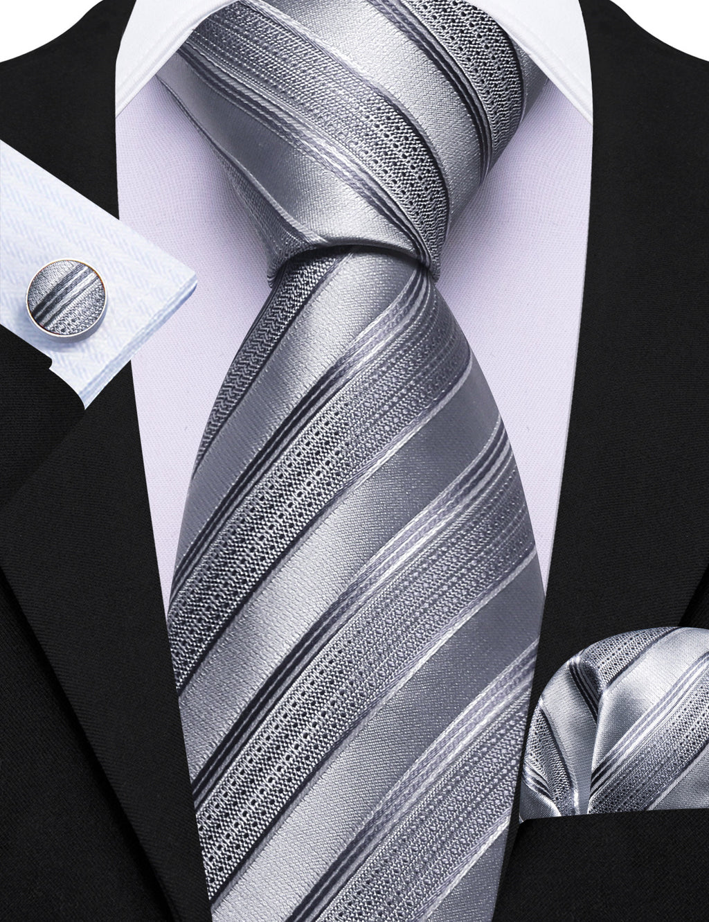 Barry. Wang Silver Tie Striped Silk Necktie Pocket Square Cufflinks Set